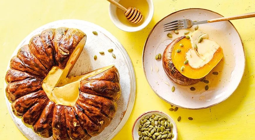 Perkelkite moliūgą į serviravimo lėkštę ir palikite visiškai ataušti. Įdaras šiek tiek sukris – taip ir turi būti. Prieš patiekdami supjaustykite dailiomis skiltimis, apliekite medumi arba pabarstykite sėklomis.