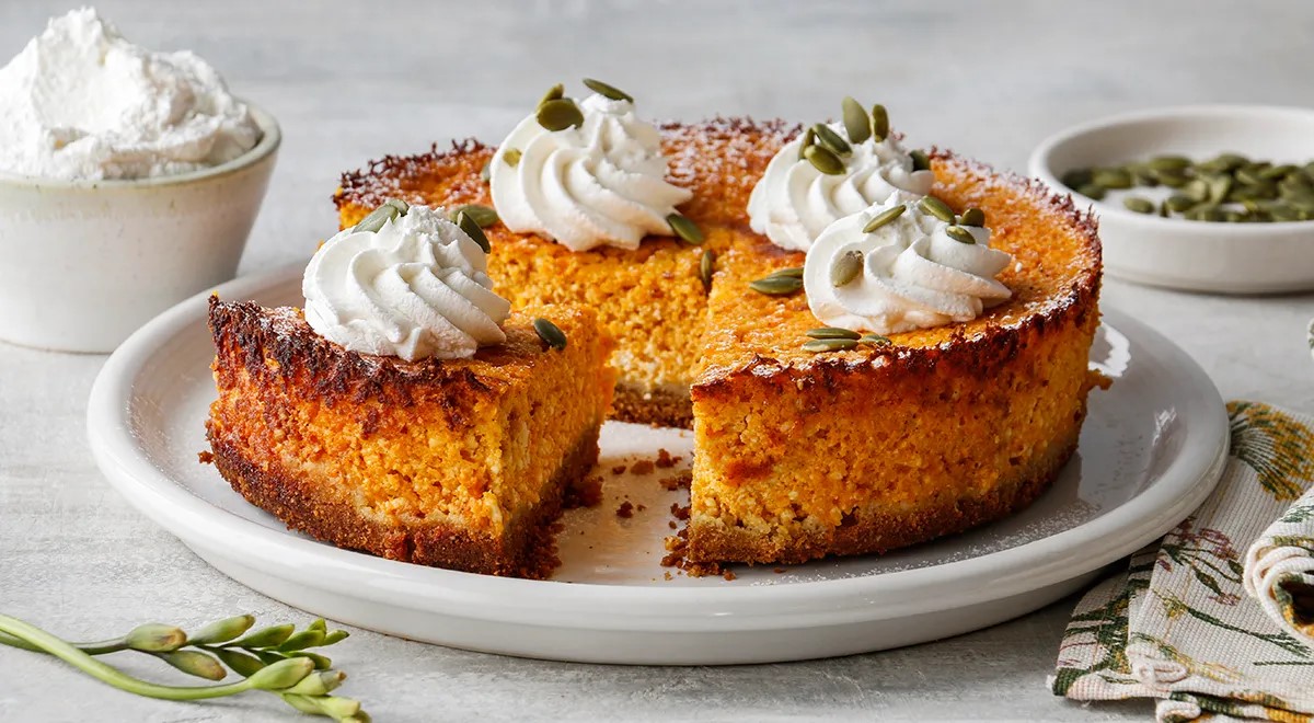 Reikės (8 porcijoms): įdarui: 250 g moliūgo minkštimo, 150 g varškės, 3 kiaušinių, 100 g cukraus, 50 g medaus, 1 šaukštelio vanilinio cukraus, 1 šaukštelio muskatų, 1 šaukštelio imbierų, 1 šaukštelio cinamono, druskos – ant peilio galiuko; kremui: 200 g varškės, 1 šaukštelio miltelinio cukraus; pagrindui: 10 biskvitinių sausainių, 50 g moliūgų sėklų, 1 šaukšto moliūgų aliejaus, 1 šaukšto medaus.