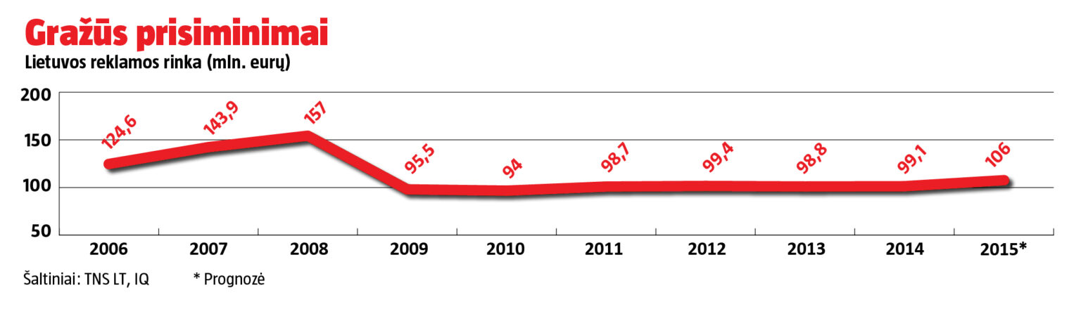 Jei prognozės pasitvirtins, visa reklamos rinka šiemet galėtų siekti apie 106 mln. eurų – panašiai kaip 2005-aisiais. „Po krizės viskas stovėjo vietoje, tačiau pagerėję verslo lūkesčiai įmonėms leis didinti rinkodaros biudžetus, todėl spartesnis prieaugis išliks ir kitais metais“, – tvirtino V. Oržekauskas.