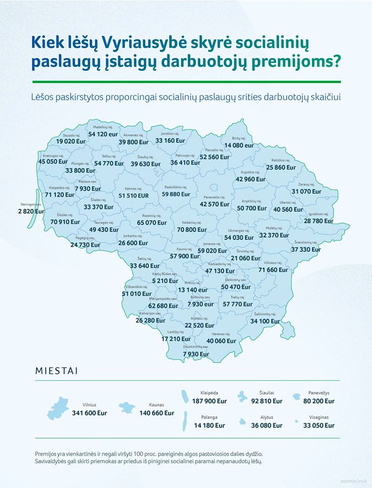 „Socialinės apsaugos ir darbo ministerija pasiūlė savivaldybių merams išmokėti vienkartines premijas socialinių paslaugų įstaigų darbuotojams, kurie karantino metu užtikrina gyvybiškai svarbias paslaugas senoliams, negalią turintiems žmonėms, įvairias socialines rizikas patiriančioms šeimoms ir globos namuose augantiems vaikams“, – BNS informavo ministerija.