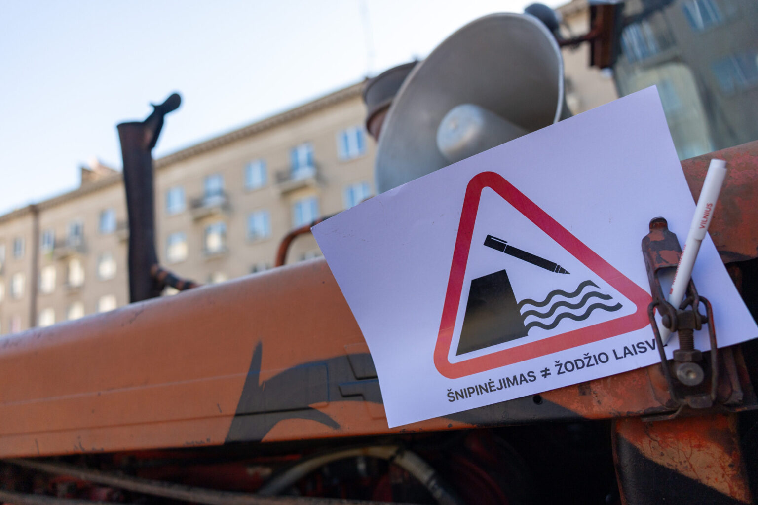 Antradienį ant buldozerio stovinčio prie Seimo, simbolizuojančio Lietuvos nacionalinio radijo ir televizijos (LRT) įstatymo pataisas, atsirado plakatas su užrašu „Šnipinėjimas nelygu žodžio laisvei“. Ant jo pavaizduotas Kultūros asamblėjos simbolio trikampis, su krentančiu rašikliu. Tiesa, šalia jo pritvirtintas ir rašiklis.