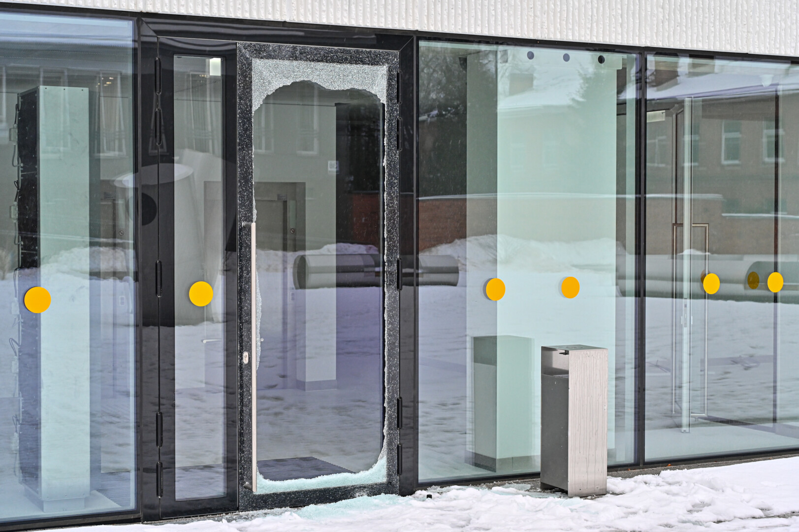 Panevėžiečiai atkreipė dėmesį į ką tik baigto statyti Stasio Eidrigevičiaus menų centro pastato šoninių lauko durų suskilusį stiklo paketą.