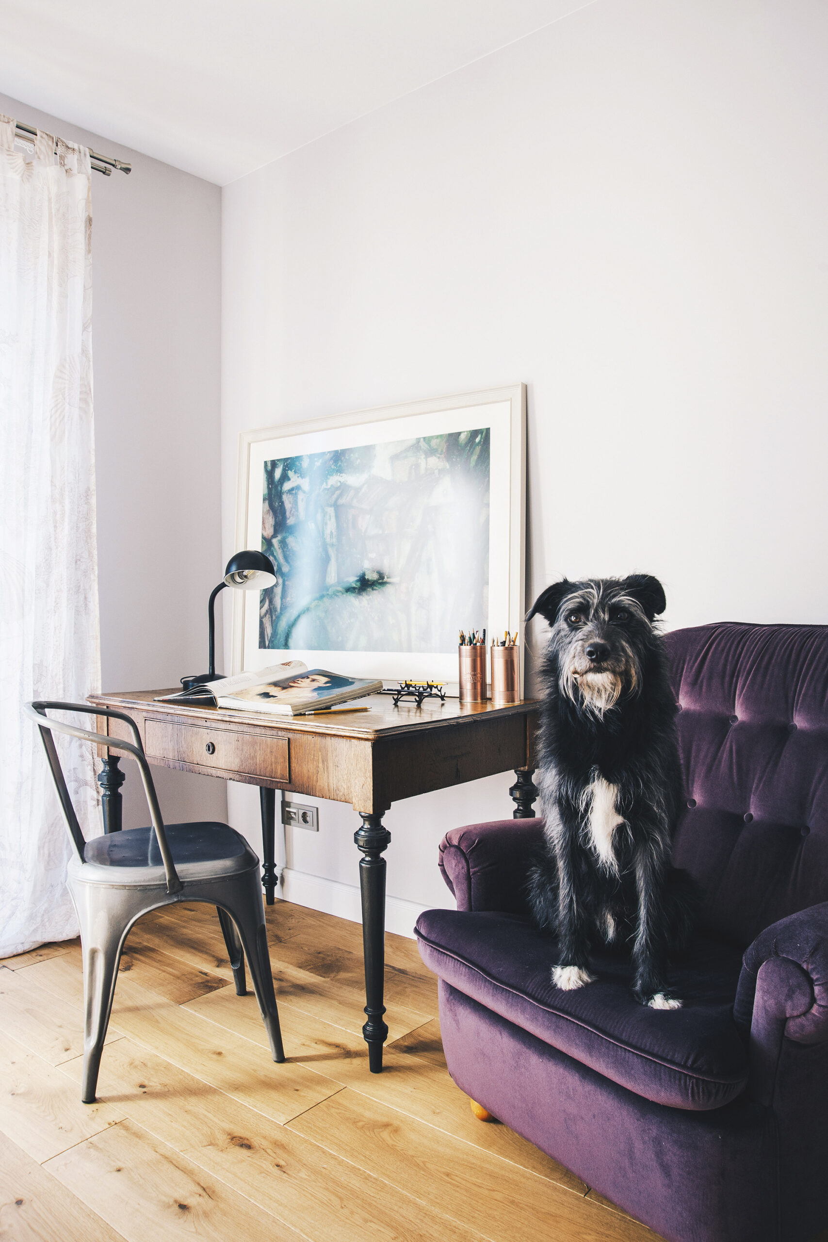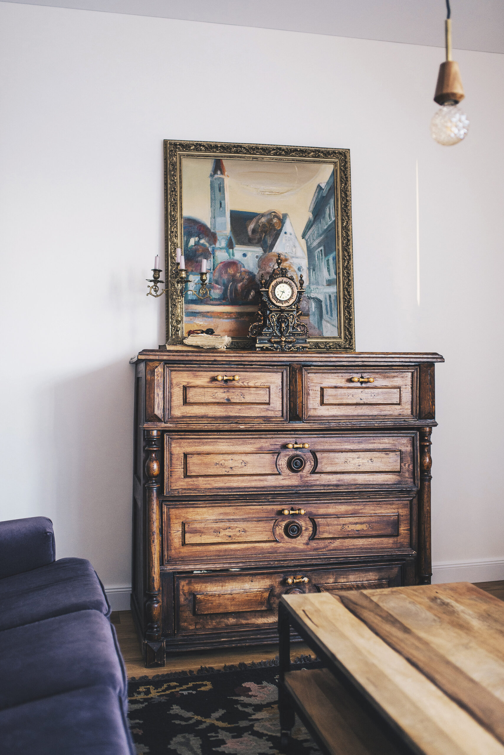 Ką daryti, jei paveldėjote brangių šeimos relikvijų, tačiau jos labiau tiktų „Marceliukės klėčiai“, o ne jūsų moderniems namams? Viena galimybė – jas sujungti į tam tikrą „retro zoną“. Šioje fotografijoje matome senovinę komodą, laikrodį, žvakidę ir praėjusio šimtmečio paveikslą, sugrupuotus pagal vario spalvą ir retro temą. Visi kartu jie atrodo organiškai ir įdomiai. Nežinia, ar šis efektas būtų juntamas, jei daiktus išblaškytume po įvairius patalpos kampus.