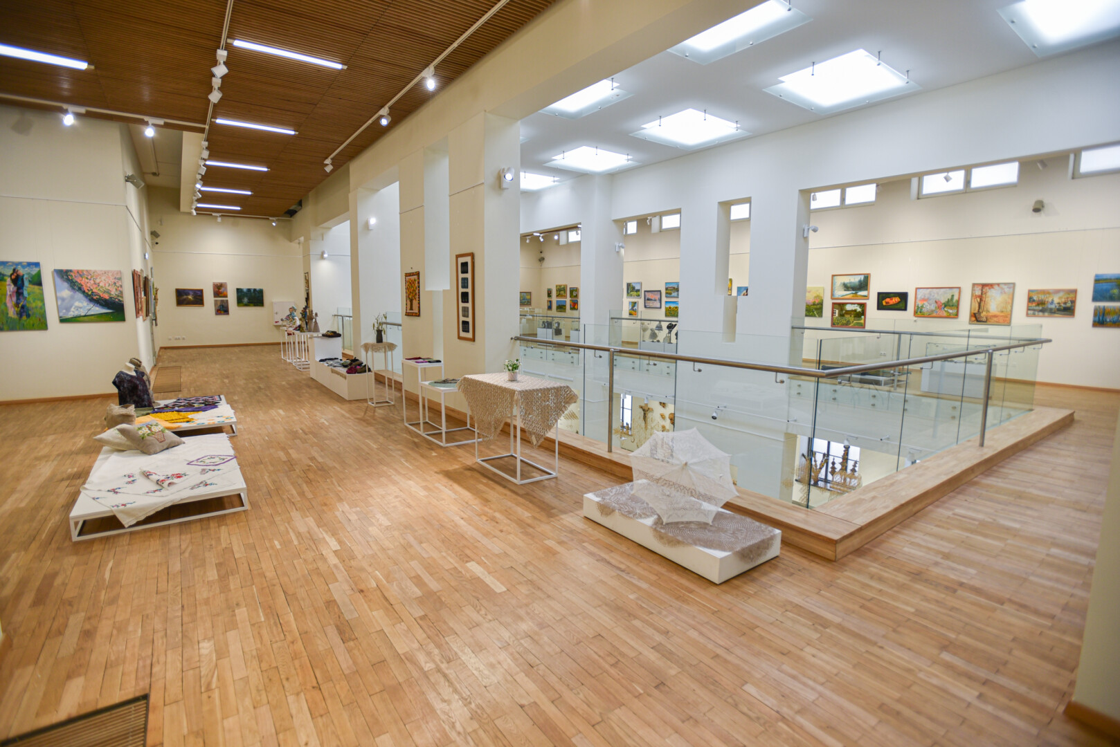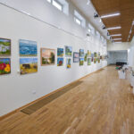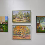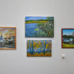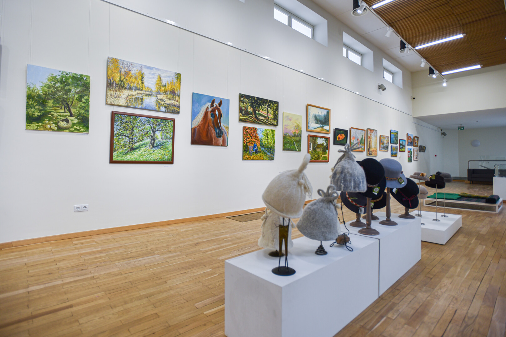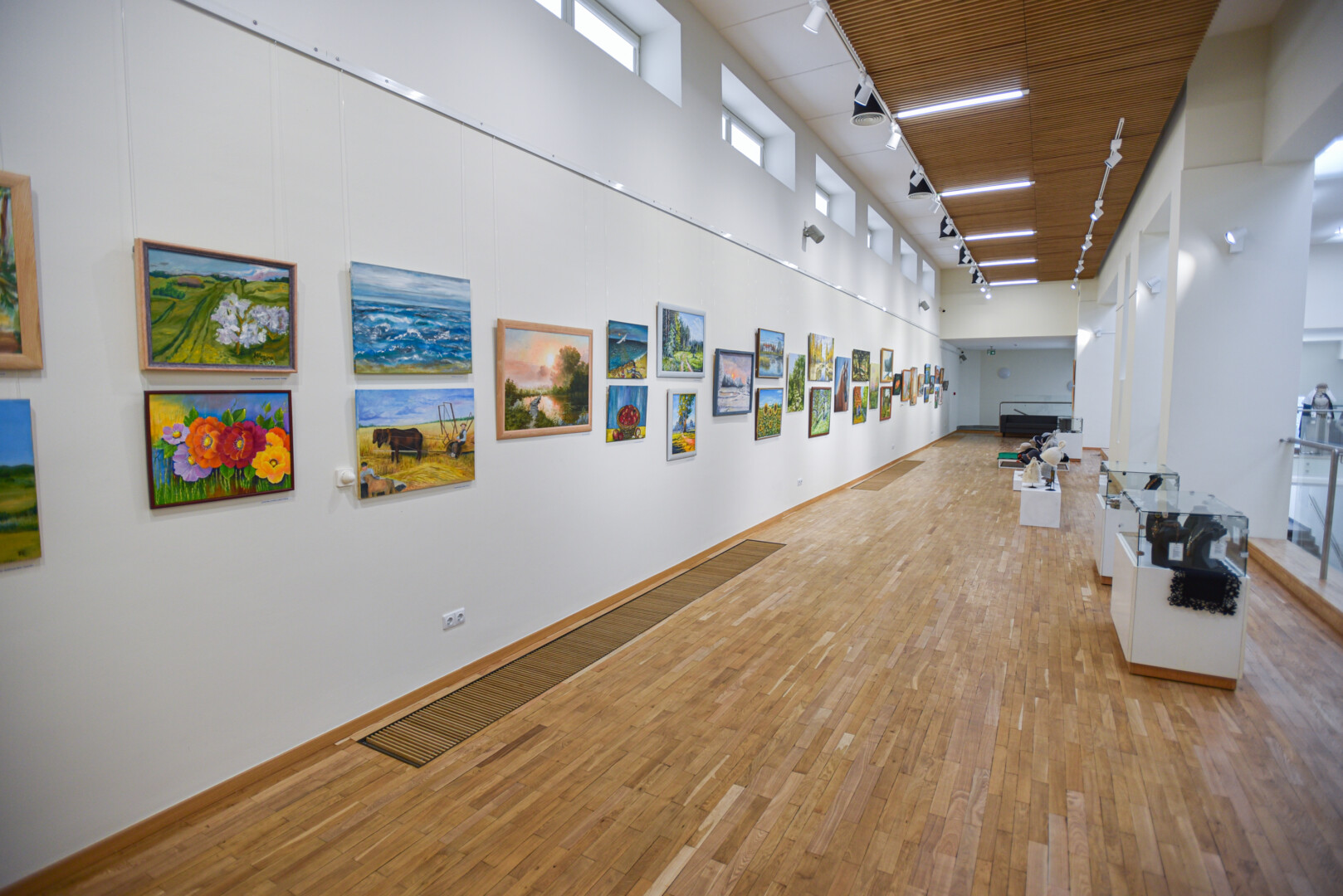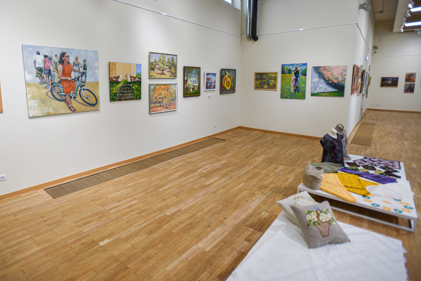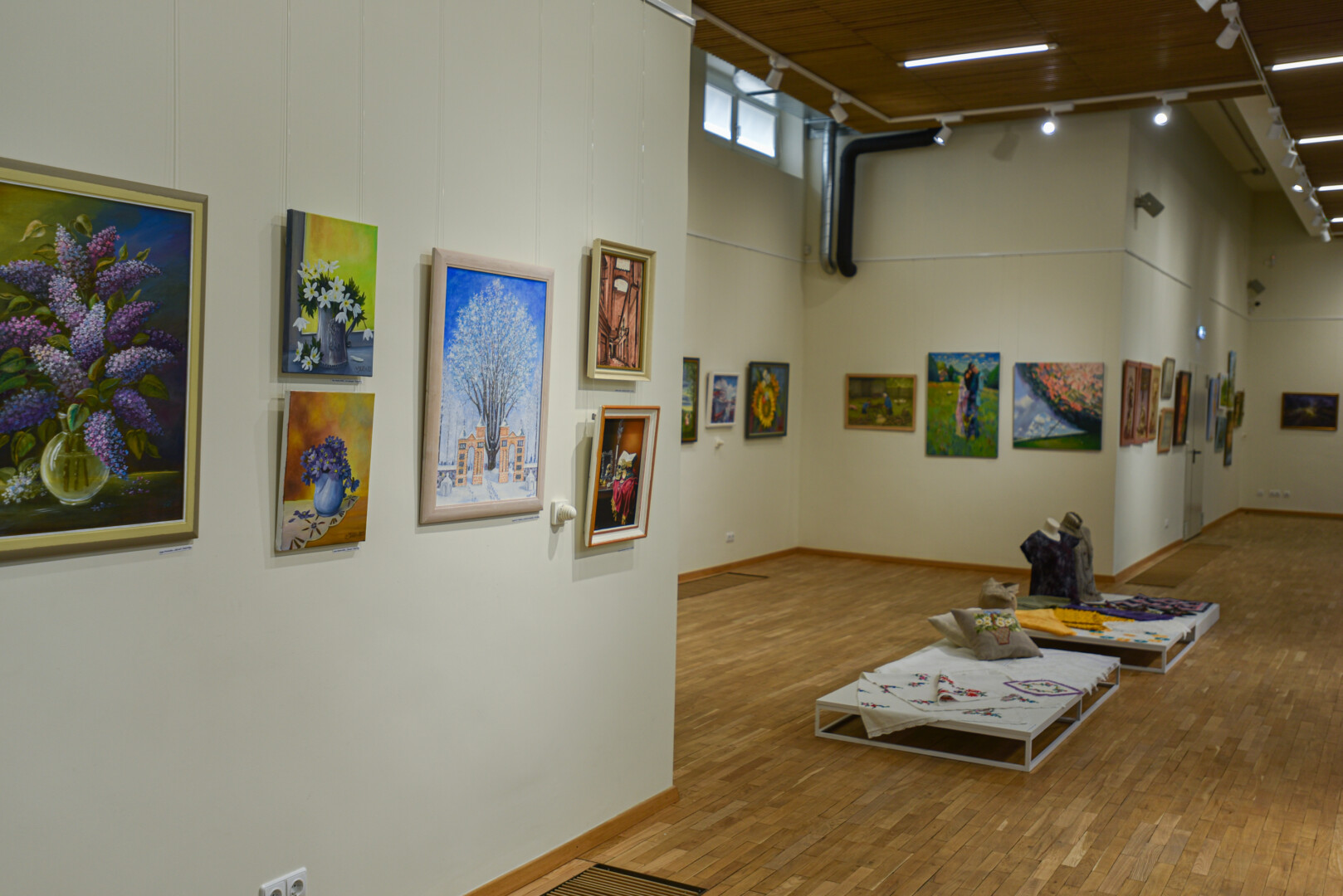 Krašto tautodailės parodoje ant sienų kaba peizažai, natiurmortai, kiti dailės darbai.