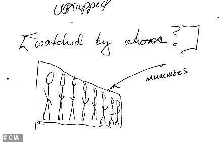 Prie CŽA ataskaitos pridėti ir aiškiaregio „sąmonės atsiskyrimo“ būklėje piešti eskizai bei pakeverzoti užrašai. Juose, be kita ko, galima atpažinti mečetės pastato kontūrus, aštuonias greta viena kitos suguldytas mumijas ir sparnuotą būtybę – serafimą.