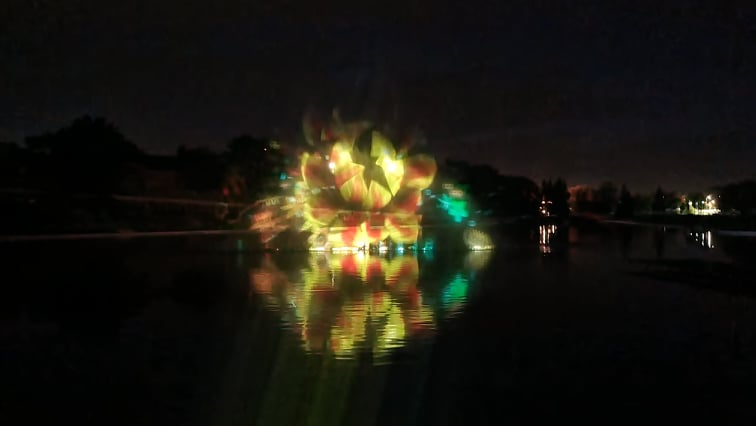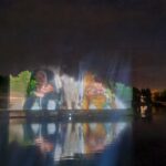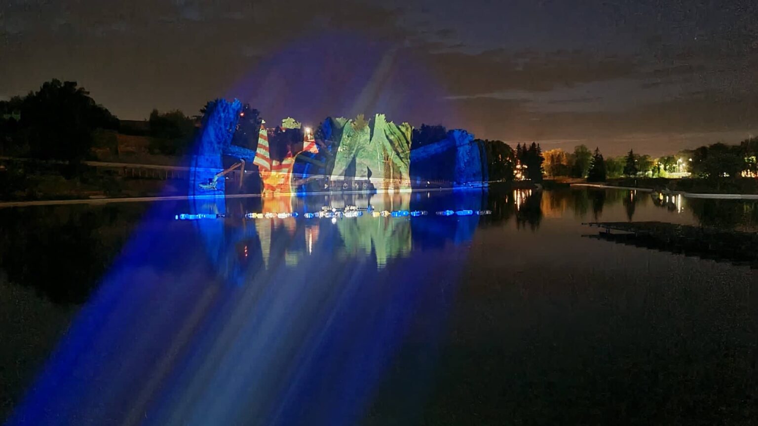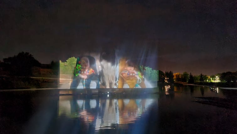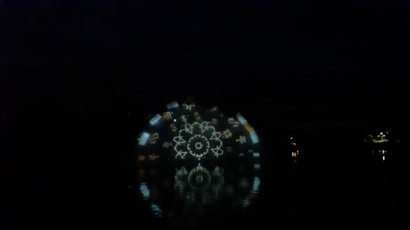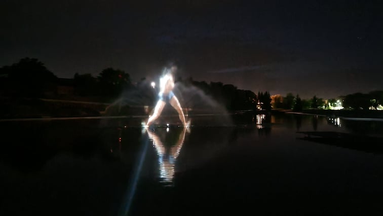 Ant išsiskleidusios vandens vėduoklės fontaną montuojantys meistrai iki vėlumos triūsė derindami įrangą vaizdo projekcijoms išgauti.