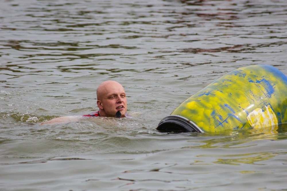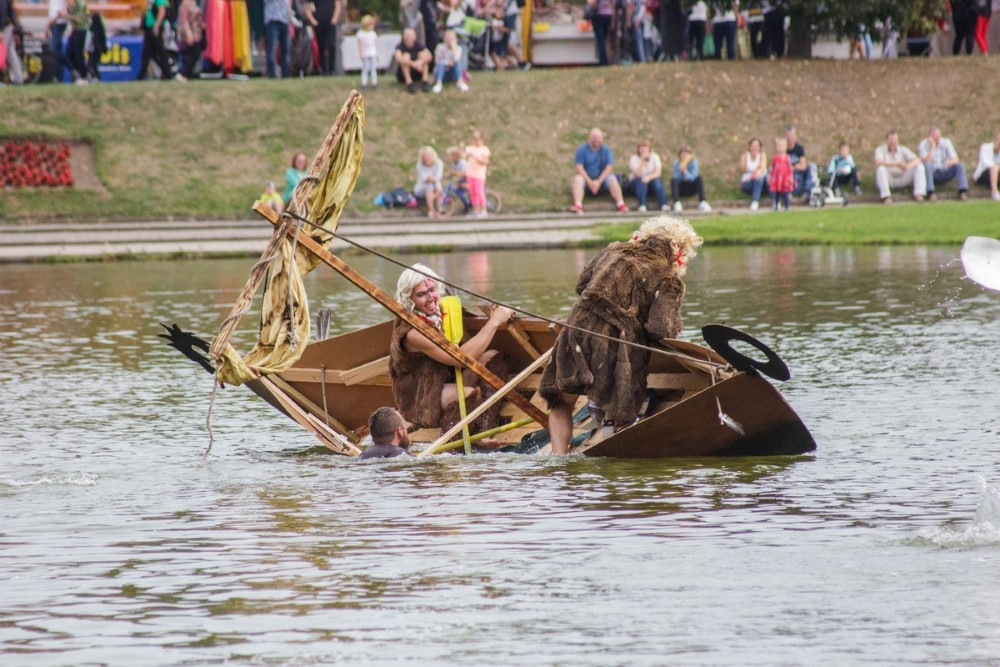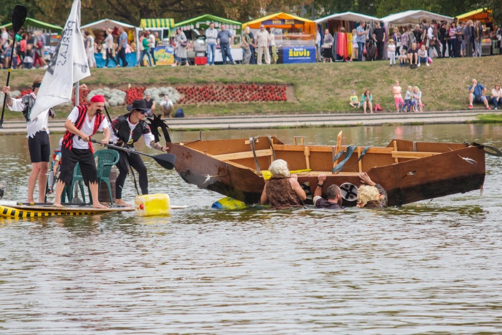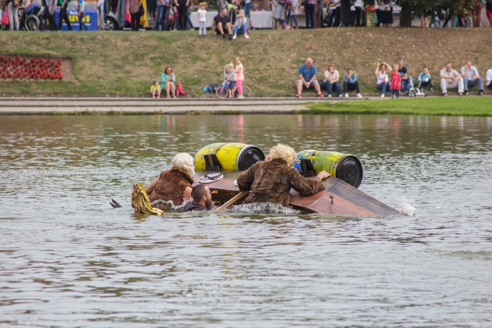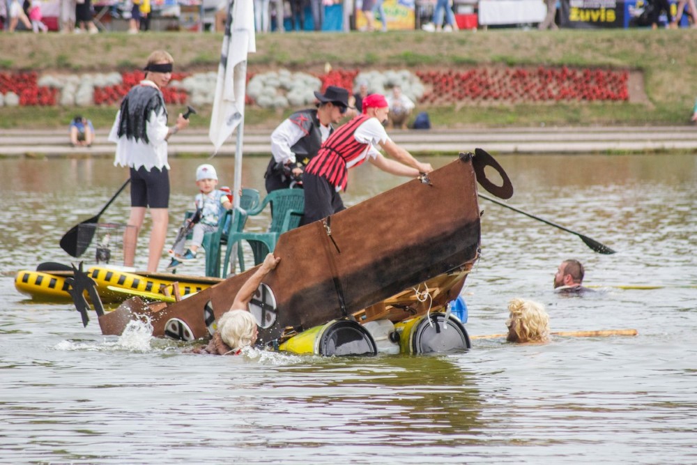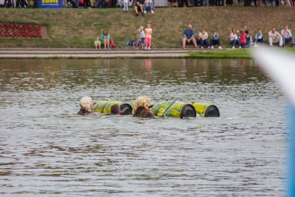 Varžybose netrūko azarto ir ekstremalių akimirkų: vienas laivas nepasiekęs kranto ėmė skęsti. Į vandenį su apvirtusia iš medžio drožlių plokštės pagaminta valtimi paniro „Valkirija“ pasivadinusi senų bičiulių, buvusių kambariokų komanda. Juos jėga „nuskandino“ „Perlai“ – veržlių piratų komanda.