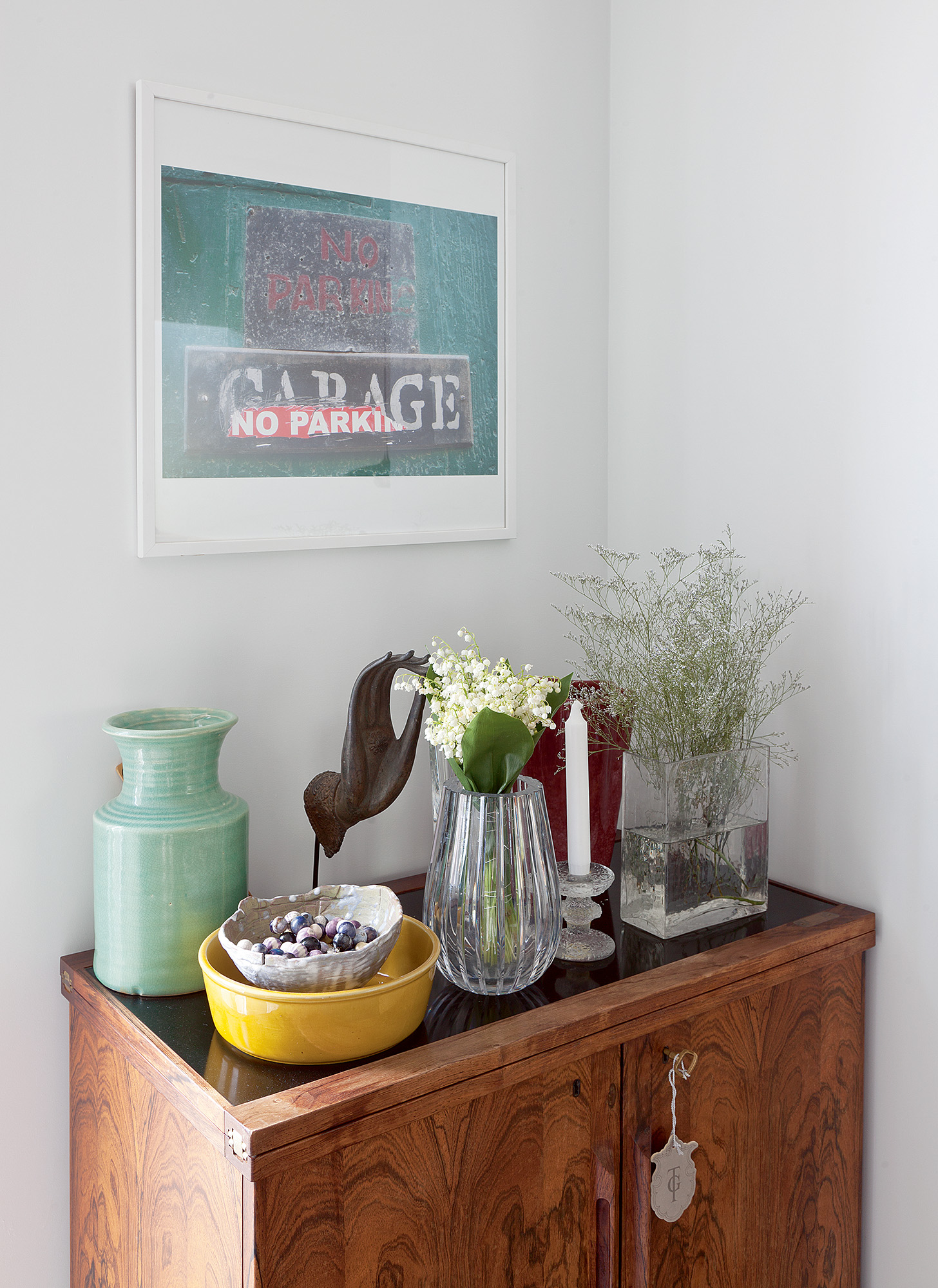 Bendroje pirmo aukšto patalpoje virtuvės ir poilsio erdves skiria valgomojo stalas ir kėdės. Šie su šeima keliauja toli gražu ne vienus metus. Net į Maltą, kur nuomojosi būstus, ji po poros gyvenimo metų iš Lietuvos atsisiuntė pilną konteinerį savo daiktų – tada vaikai pasijuto kaip namie. „Kai nusiperki gerą baldą, jis su tavimi gyvena visą gyvenimą. Šviestuvas, stalas, valgomojo kėdės su mumis keliauja visur. Sofoms jau 10 metų. Pakeičiau jų audinius, ir vėl kaip naujos. Geri daiktai tarnauja ilgai. Dar yra objektai, kuriuos renkame, pavyzdžiui, mano vyrui labai patinka šeštojo dešimtmečio baldai“, – kaip kuria namus, pasakoja moteris.