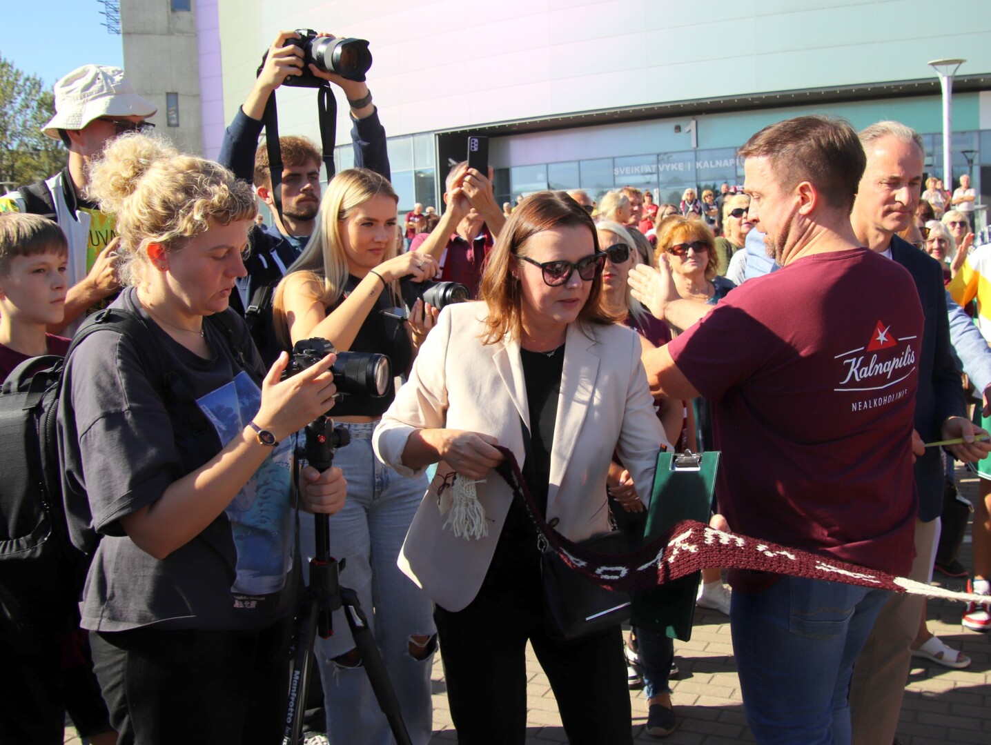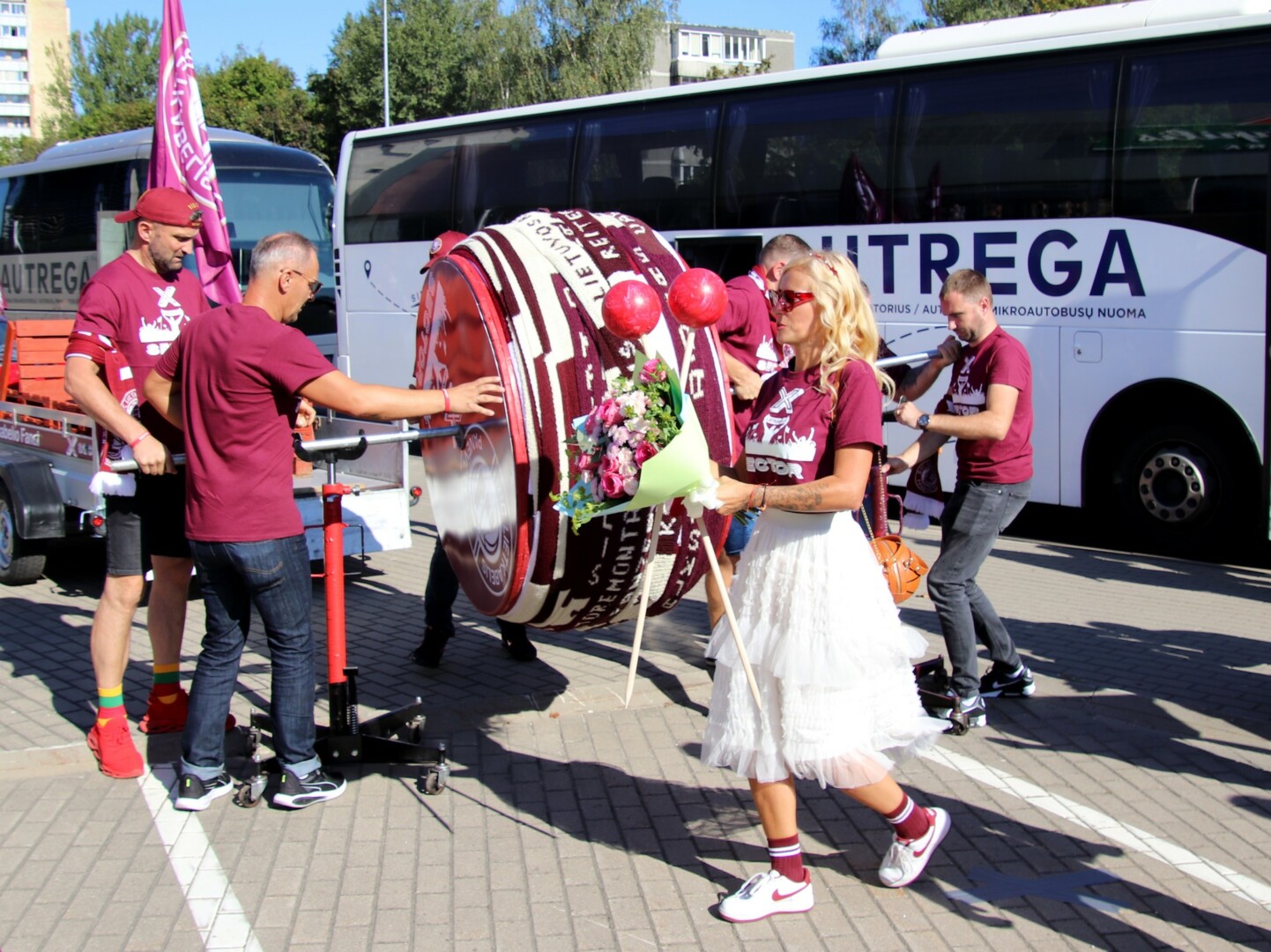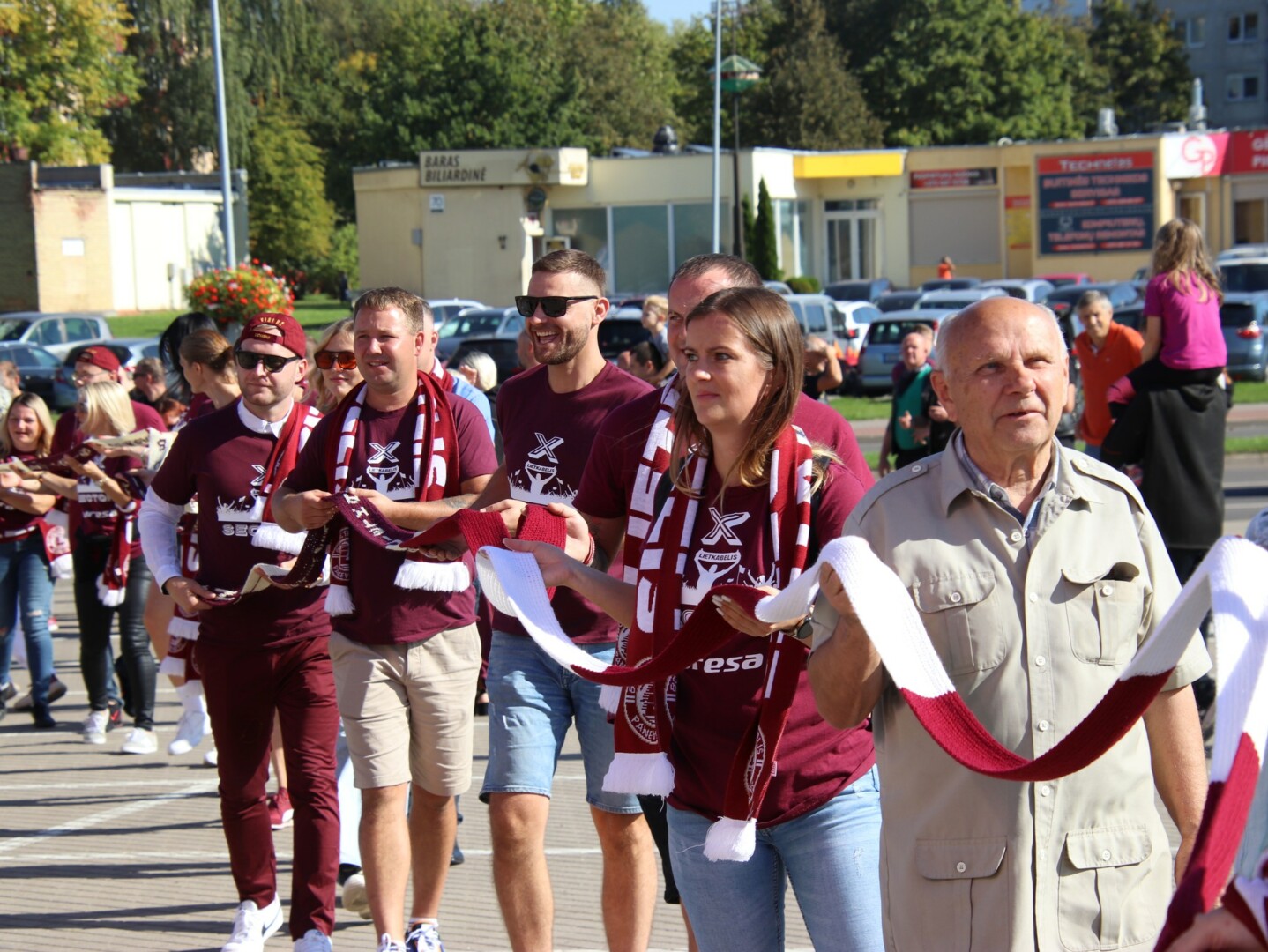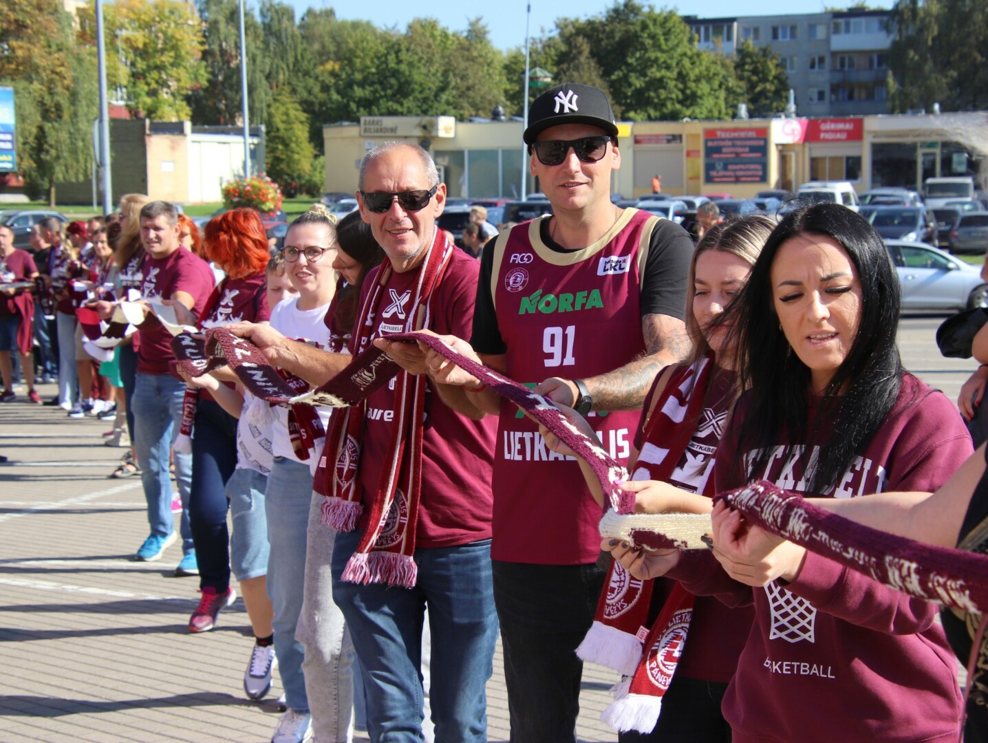 Krepšinio gerbėjai čia atvežė ir visos vasaros rezultatą – 1650 metrų ilgio, 12 cm pločio rankomis megztą „Lietkabelio“ spalvų bordinės ir baltos šaliką.