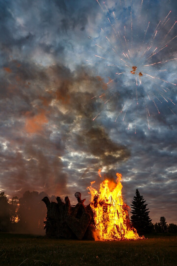 Sekmadienio vakarą surengus interaktyvų spektaklį „Kas iš tiesų nutiko katės namams?“ paskutinė parko skulptūra – šiaudinė pilis – atiduota ugniai.