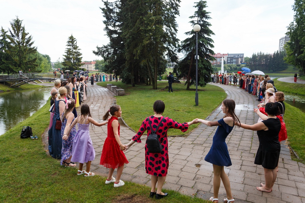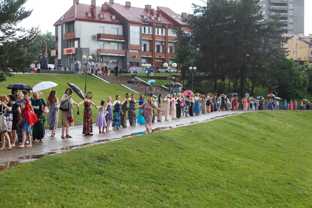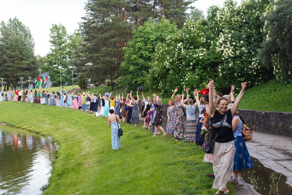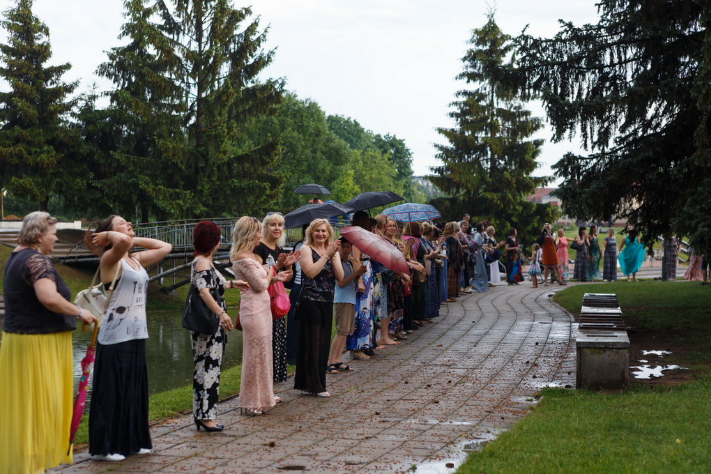 Galiausiai gausus sijonuotų damų būrys patraukė į Senvagę – apjuosti vieną gražiausių miesto vietų rekordine gyva grandine.