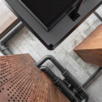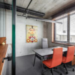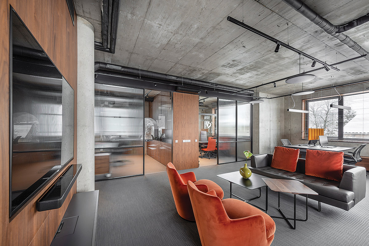 Sostinės Žvėryno rajone esantis biuras iki smulkmenų suplanuotas produktyviam darbui, bet primena jaukius namus. „Biuro patalpos turi savo estetiką: monolito sienas, lubas. Jas sumaišius su šiltos riešuto faneros elementais, sukurtas labai šiltas ir jaukus interjeras“, –kartu su kolega Roku Puzinu kurtą interjerą pristato architektūros ir statybos studijos „Prusta“ architektė-dizainerė Ieva Prunskaitė.