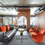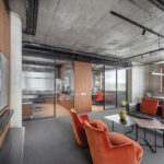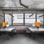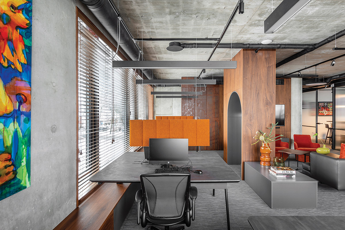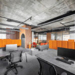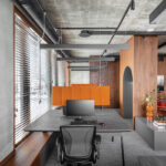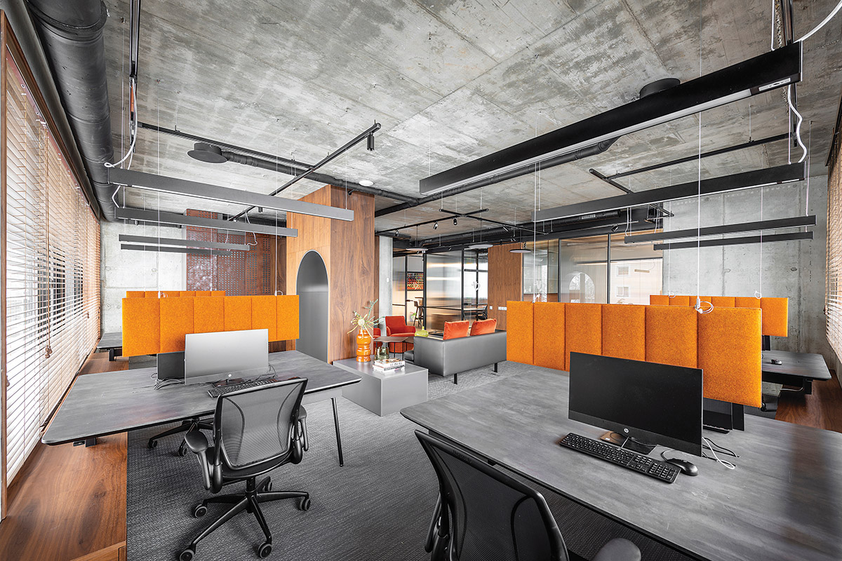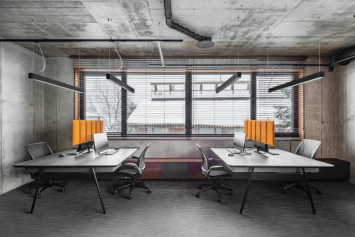 Logistikos įmonės darbuotojai daug kalba telefonu, todėl bendroje patalpoje darbo vietos atskirtos oranžinėmis akustinėmis sienelėmis. Platūs, erdvūs darbo stalai, kaip ir kiti biuro baldai, pagaminti pagal individualų projektą. Architektė atkreipia dėmesį į netradicinius stalviršius: „Norėjome daugiau gyvybingumo, todėl pasirinkome nevienalytį betono raštą.“