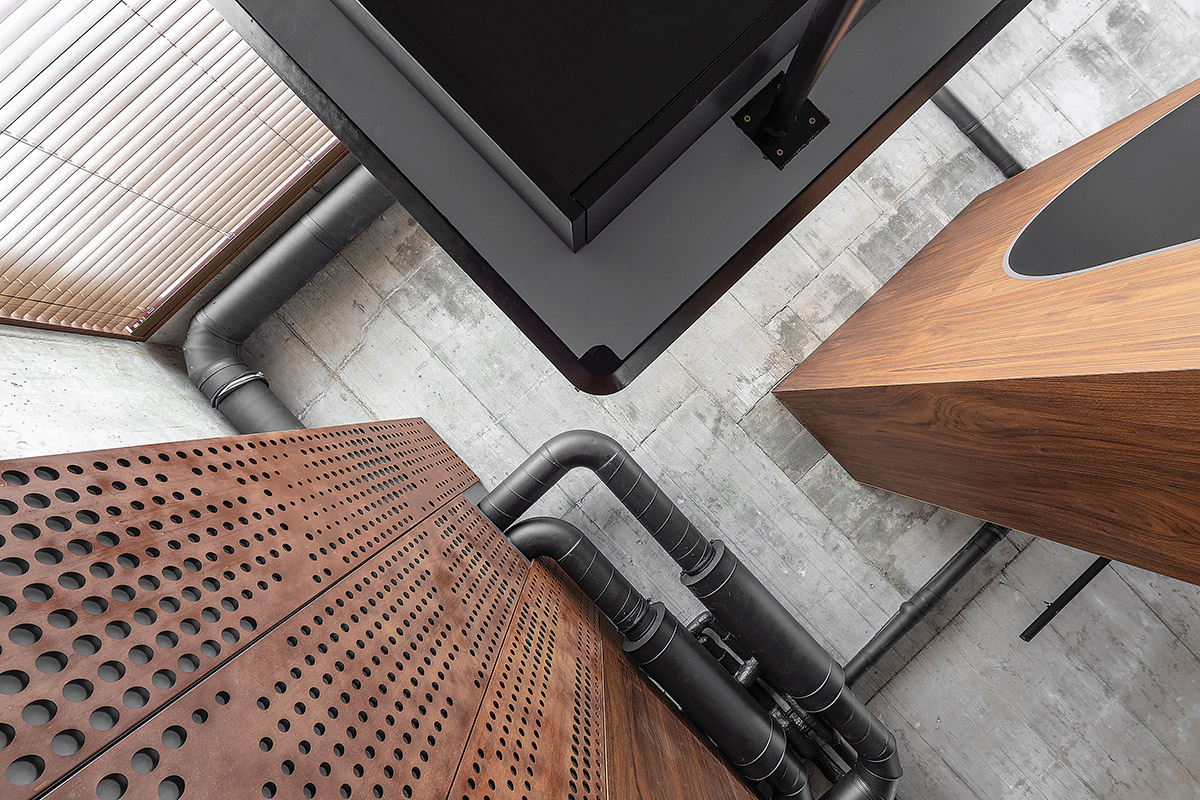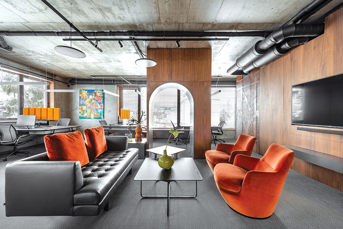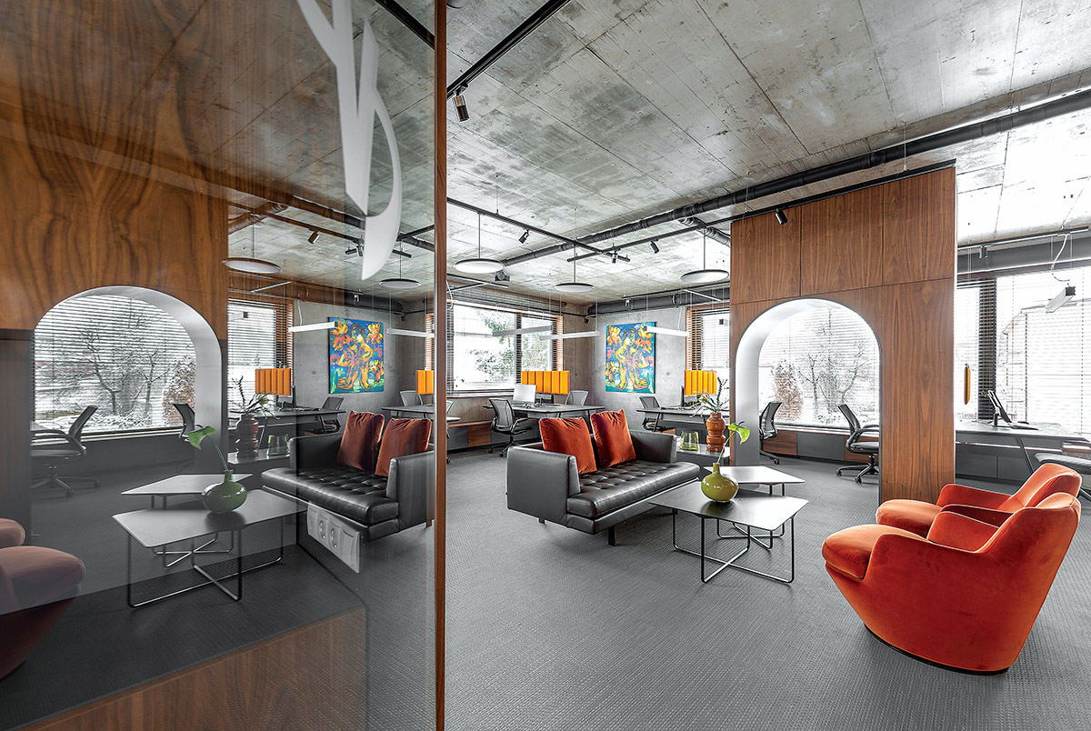 Bendrą biuro erdvę riešutmedžio arka simboliškai skiria į dvi zonas – darbo ir poilsio, tačiau neužgriozdina vaizdo. Ji atlieka ir kitą svarbią funkciją – tai spausdintuvui skirtas baldas ir dokumentų spinta.