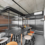 Virtuvė skirta ne tik pietų pertraukai. Prie ilgo paaukštinto stalo galima posėdžiauti arba dirbti, panorus pakeisti sėdėjimo vietą. „Virtuvė turėjo nepriminti virtuvės. Čia naudojome tas pačias medžiagas, kaip ir likusioje erdvėje. Net plytelių siena šalia darbastalio atrodo lyg dekoras“, – pasakoja interjero kūrėja.