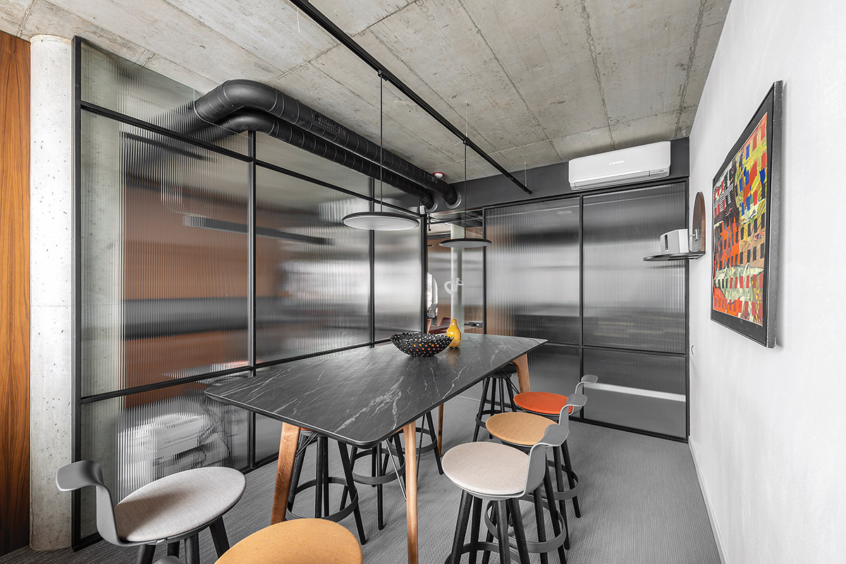 Direktoriaus kabinetas, buhalterija ir su virtuve sujungtas pasitarimų kambarys nuo bendros patalpos šurmulio apsaugotas garsą slopinančiomis stiklo pertvaromis, laminuotomis akustine plėvele. Profiliuoto stiklo sienelės padėjo išspręsti ir kitus klausimus: jos neuždaro erdvės, praleidžia šviesą, bet blokuoja vaizdą, nes nėra visiškai skaidrios.