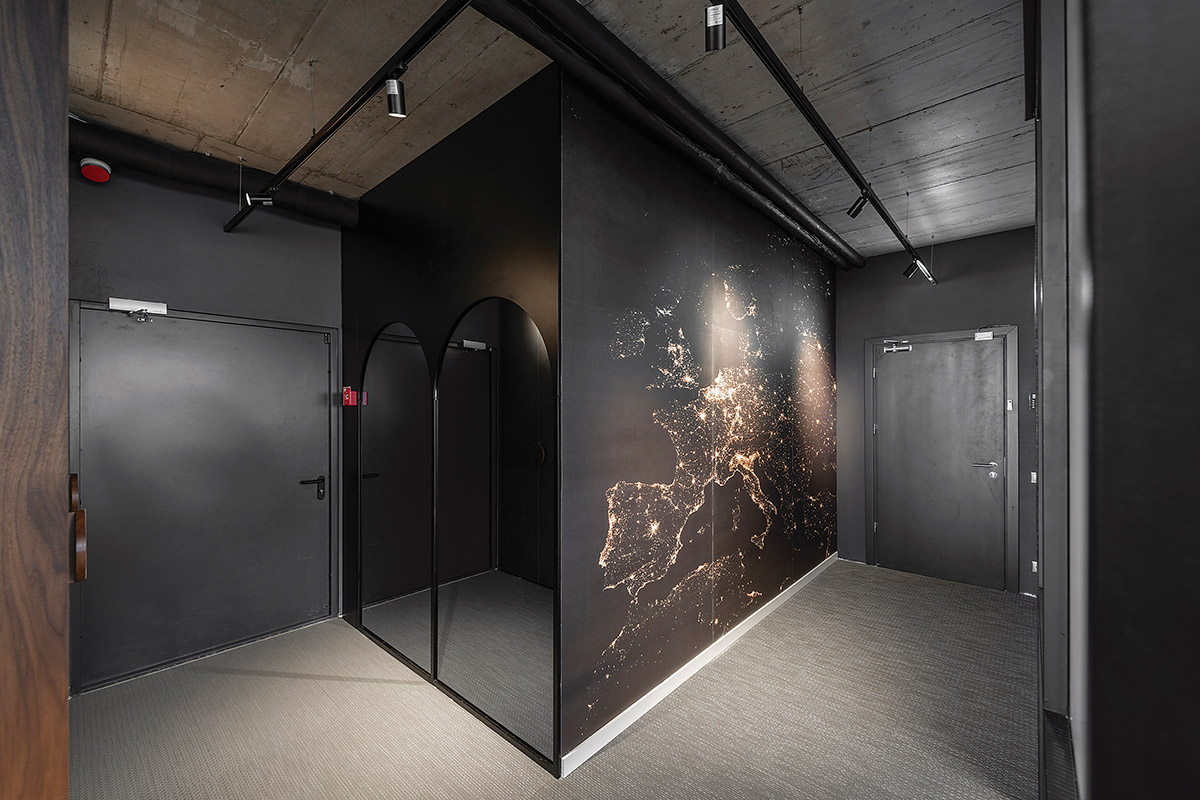 Šalia įėjimo stovinti juoda drabužių spinta dekoruota naktiniu pasaulio žemėlapiu. Jis simbolizuoja čia įsikūrusios įmonės „SV Logistic“ ideologiją. Šiltos spalvos, minkšti audiniai, dekoro elementai pastabesniam lankytojui išduoda, kad kolektyve dominuoja moterys.