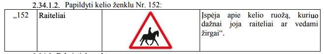 Tiesa, siūloma Kelių eismo taisykles taip pat papildyti vienu nauju įspėjamuoju ženklu „Raiteliai. Jis įspėtų apie kelio ruožą, kuriuo dažnai joja raiteliai ar vedami žirgai.