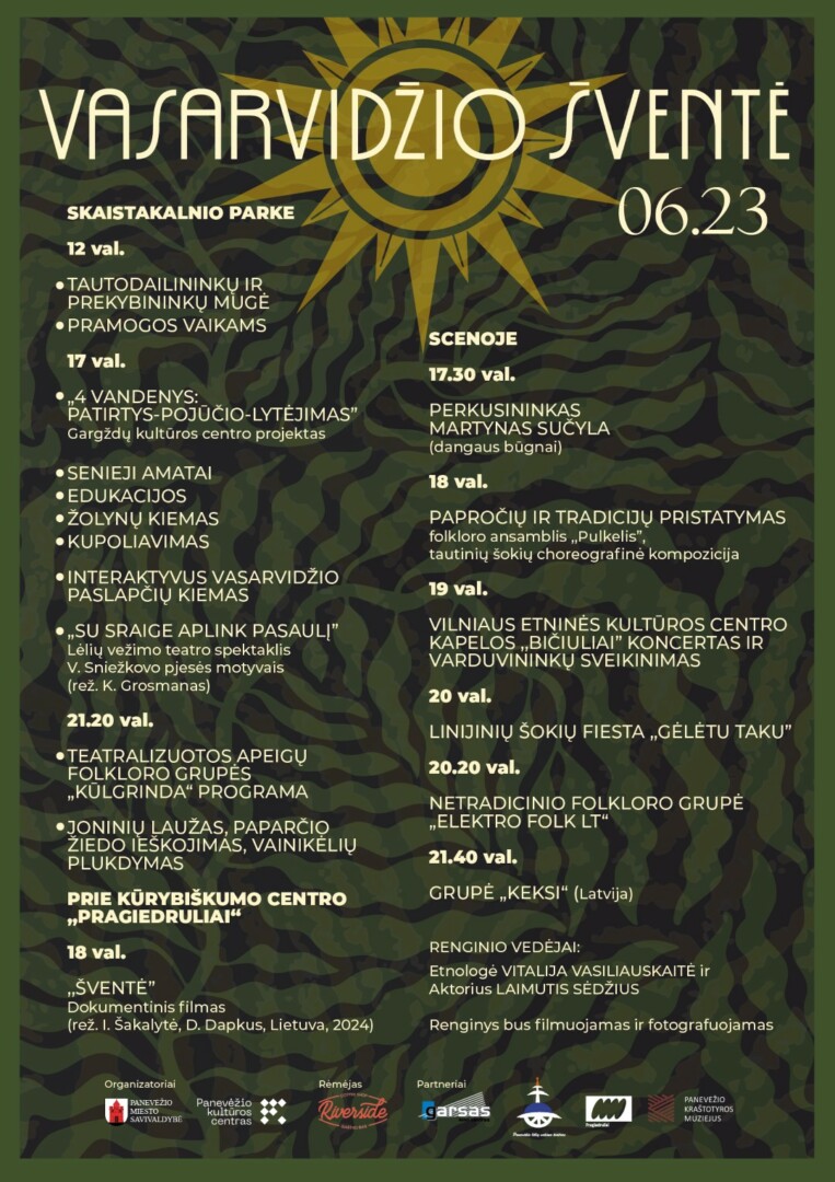 Nuo 17 val. prasidės aktyviosios šventės veiklos. Dalyviai galės susipažinti su tradiciniais amatais, kuriuos pristatys medžio drožėjas Albertas Valikonis bei tapytojas Kęstutis Vaičiūnas, dalyvauti edukacijose, aplankyti interaktyvų „Vasarvidžio paslapčių taką“, kuriame lauks burtai, lauko žaidimai ir kitos staigmenos. Tautinio paveldo puoselėtojai iš Ukmergės demonstruos autentišką šakočių kepimą, o „Žolynų kieme“ visi bus kviečiami kurti originaliausius vainikus, klausytis žolininkų pasakojimų apie augalų gydomąją galią, mokytis pinti žolines skrybėles ar net išbandyti senąsias ritualines apeigas. Čia pat bus pristatomas ir Gargždų kultūros centro interaktyvus projektas „4 vandenys: patirtys, pojūčiai, lytėjimas“, kviečiantis pajusti jūros švelnumą, marių paslaptis, ežero tylą ir upės jėgą. Mažieji žiūrovai bus laukiami Panevėžio lėlių vežimo teatro spektaklyje „Su sraige aplink pasaulį“.