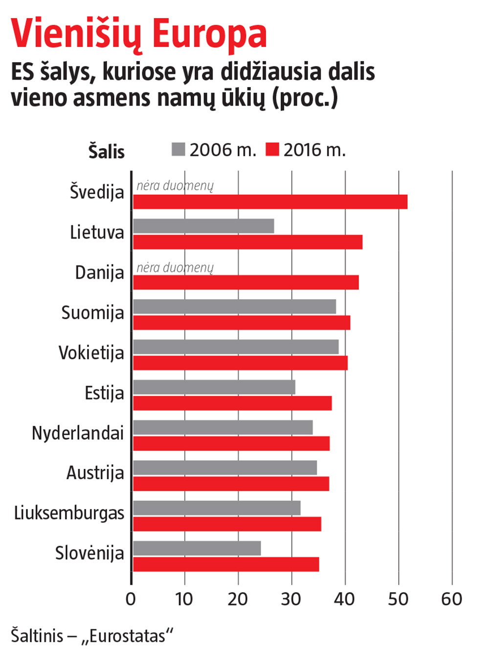 Lietuva savo vienišių būriu nelabai skiriasi nuo Europos. „Eurostato“ duomenimis, ES yra 220 mln. namų ūkių, 33,1 proc. jų sudaro po vieną gyvenantys žmonės. Šis rodiklis per dešimtmetį pakilo beveik 4 proc. Vienvaldė lyderė sąraše yra Švedija – čia po vieną gyvenančių asmenų dalis jau perkopė pusę (51,8 proc.) namų ūkių.