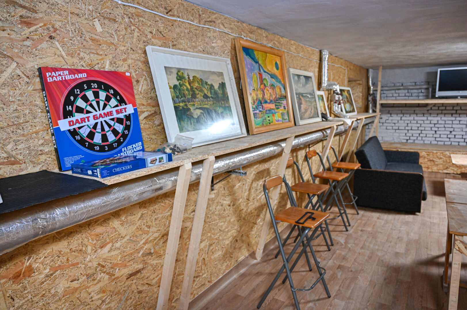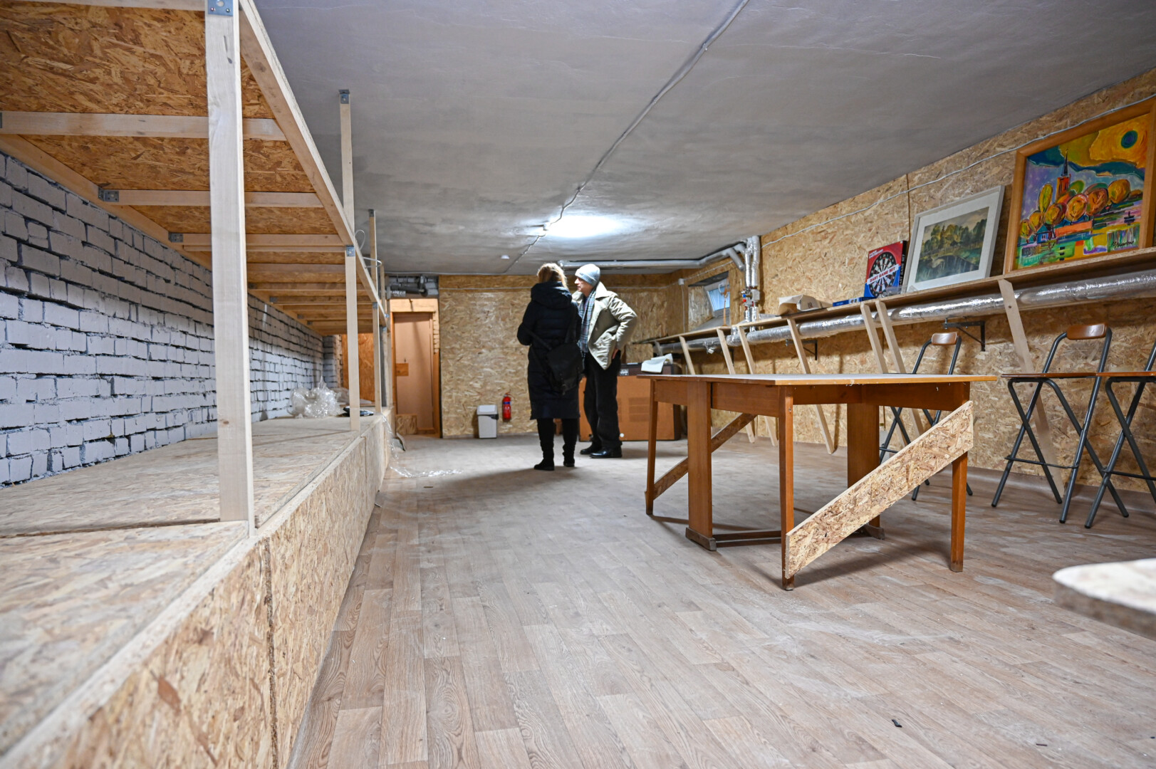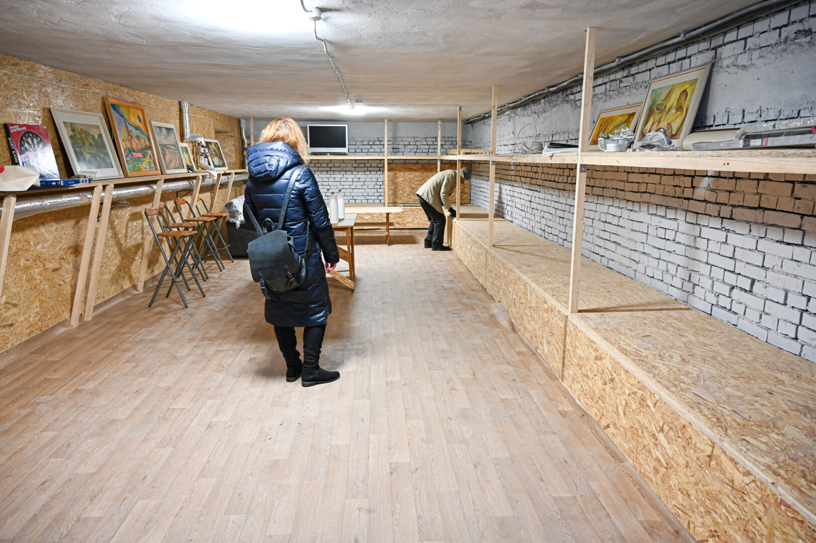 Iš bendrų rūsio patalpų išnešę nereikalingus daiktus ir išvalę per daugybę metų susikaupusias dulkes, buvo dezinfekuotos ir naujai perdažytos sienos, sudėtos laminato grindys, o palei sienas įrengti dviejų aukštų gultai. Slėptuvėje atsirado ir televizorius, vargonėliai, įvairių stalo žaidimų. P. ŽIDONIO nuotr.