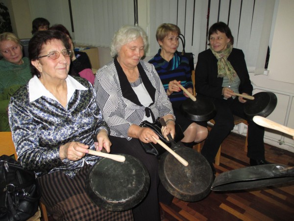 Susipažinus su muzikiniais instrumentais, senjorams teko pagroti ir patiems. Buvo išdalytos penkios ketaus keptuvės ir reikėjo vos priglaudžiant pagaliuką ritmiškai pagroti melodiją. Tai pasirodė gana sunki užduotis. Dar sunkiau buvo ritmiškai pagroti skudučiais. Tik labai stengiantis pavyko išgauti melodiją.