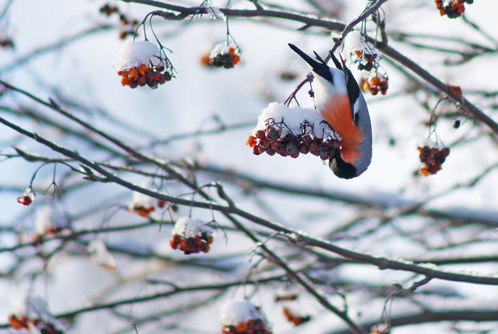 Vasarą miško tankūs lapai slepia sniegenas nuo svetimų akių. Tačiau žiemą, prieš nušalusias šakas ir baltą sniegą, jų ryškios plunksnos matomos iš toli.