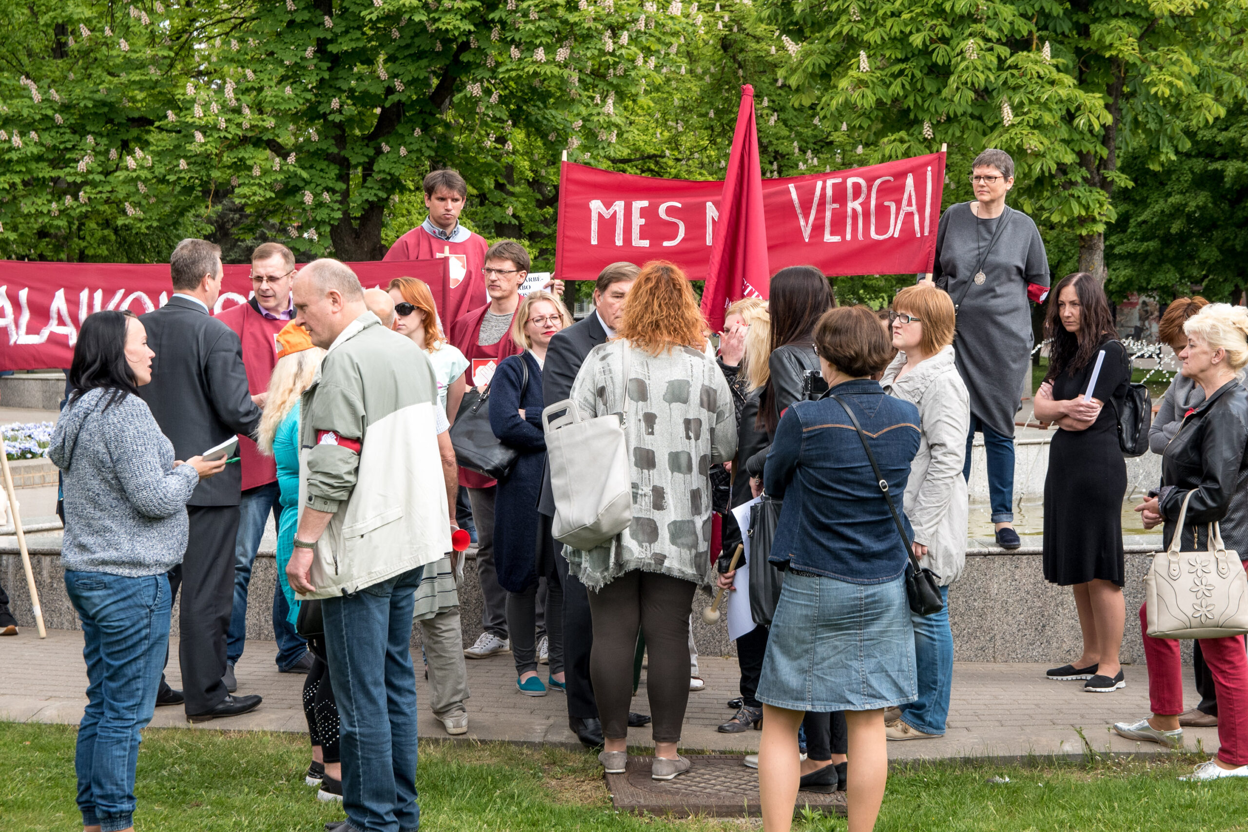 „Mes – ne vergai“, „Nevykite mūsų iš Lietuvos“, „Vienybė – jėga“ – tokie ir panašūs šūkiai penktadienį prieš pietus dvi valandas drebino pagrindinę Panevėžio aikštę. Čia apie 40 streikuotojų būgnų, sirgalių dūdelių garsais, vėliavų mostais reikalavo juos išgirsti dėl esą sudėtingos darbuotojų situacijos Panevėžio socialinių paslaugų centre.