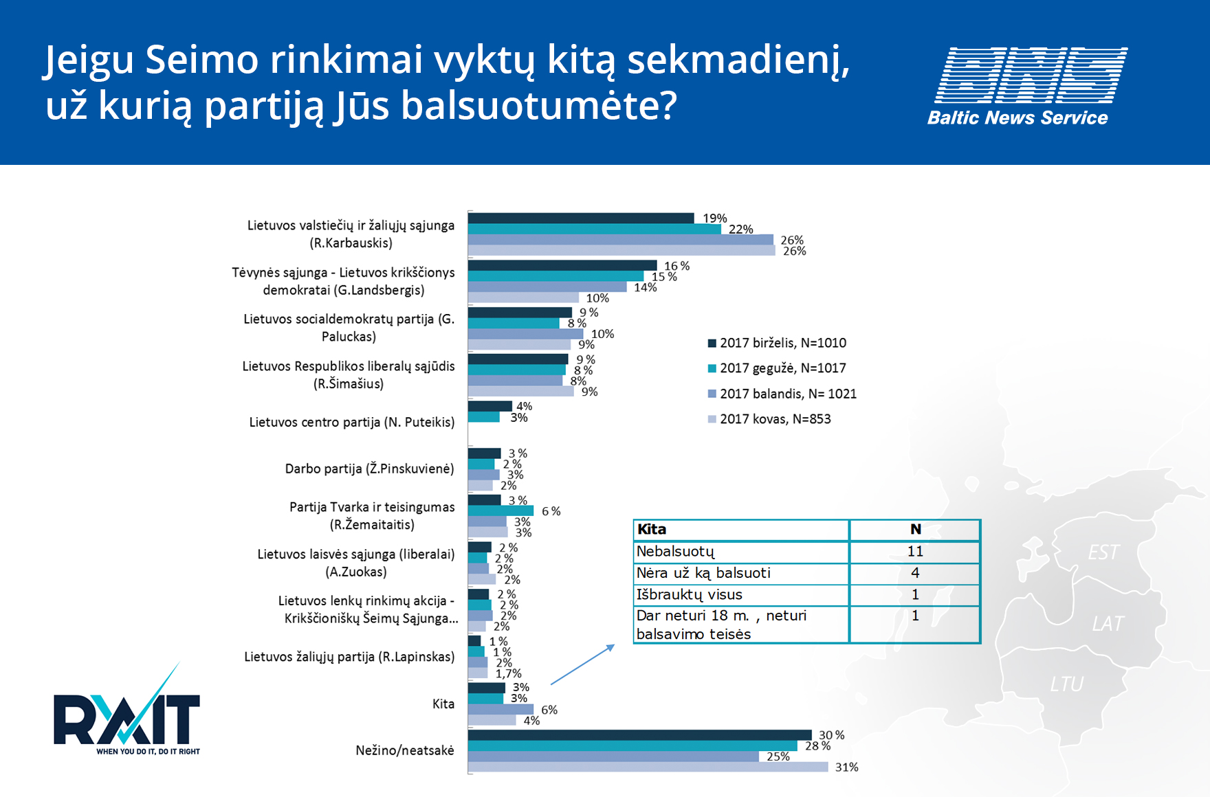 Už „valstiečius“ tyrimo metu žadėjo balsuoti 19 proc. apklaustųjų, už konservatorius – 16 proc. respondentų. Atotrūkis tarp šių partijų nuosekliai mažėja pastaruosius keturis mėnesius.