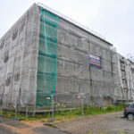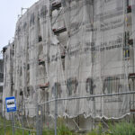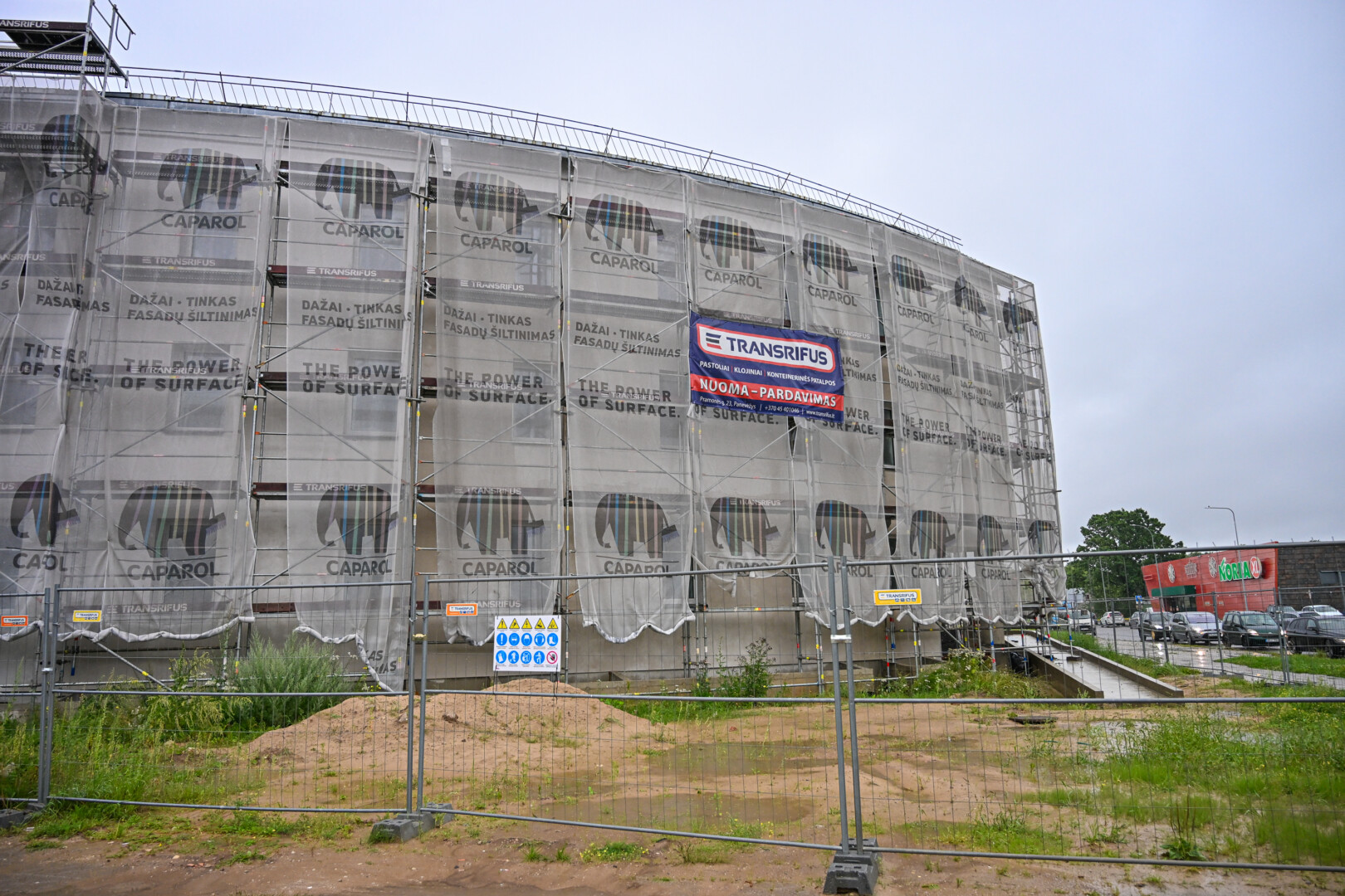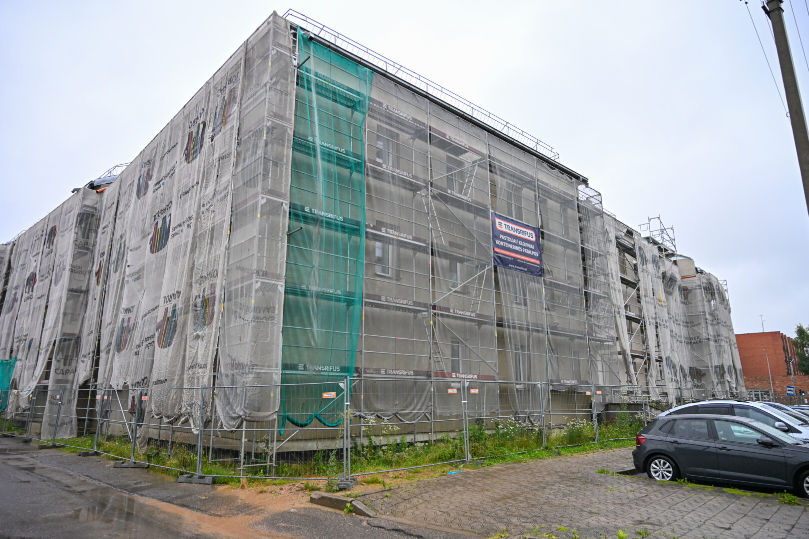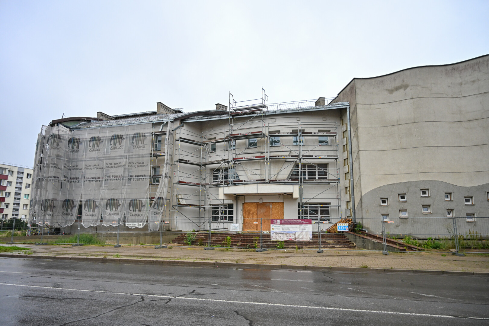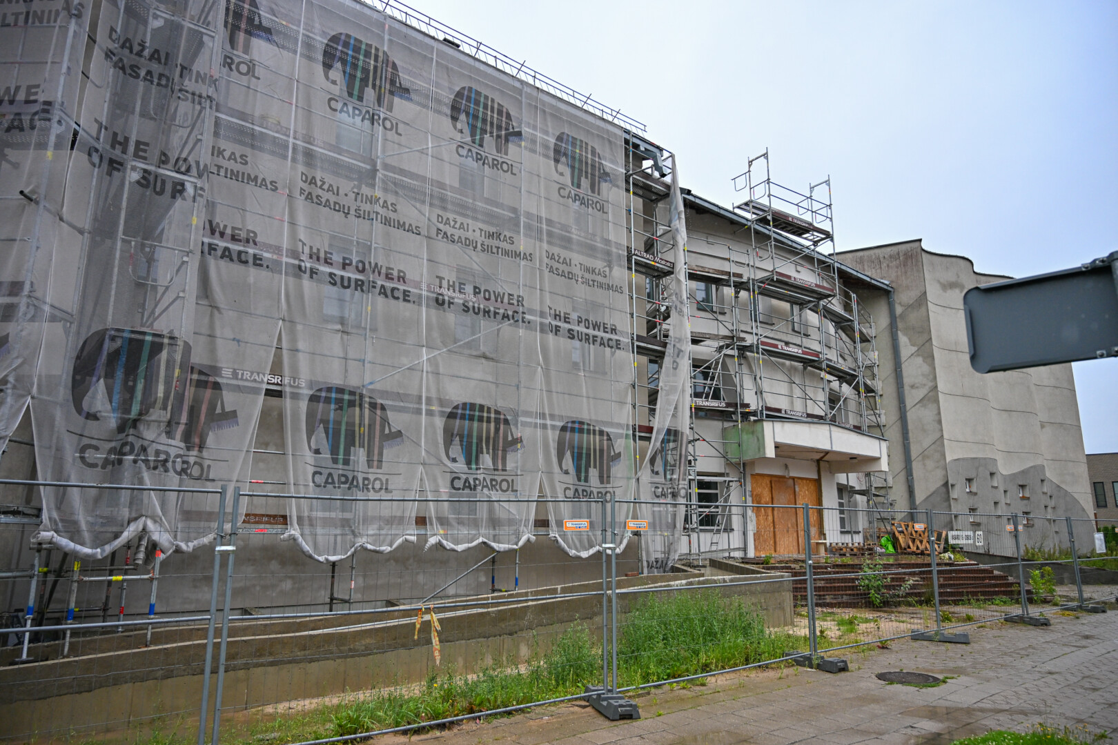Prie statybinės tvoros pritvirtintame tente skelbiama, kad remontas turėjo būti baigtas antrą šių metų ketvirtį.
