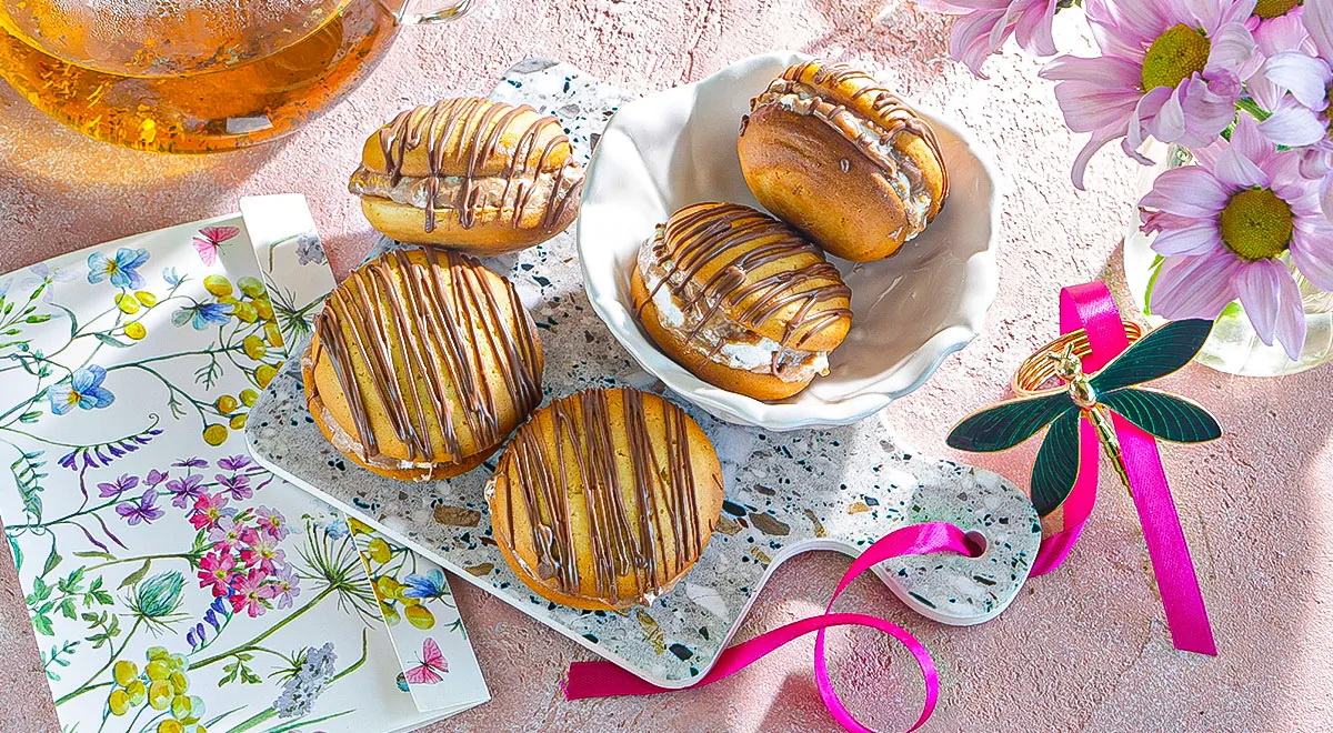 Zefyrų įdaru suklijuokite po du sausainius ir papuoškite lydyto pieninio šokolado raštais.