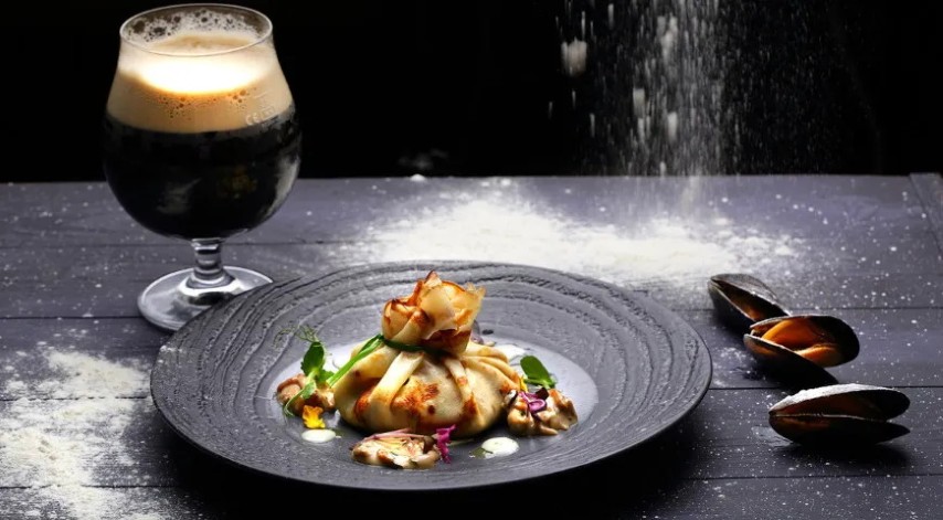 Reikės (1 porcijai): 200 ml pieno, 300 ml tamsaus alaus, 3 kiaušinių, 175 g miltų, 12 g cukraus, 100 ml aliejaus, sodos – ant peilio galiuko, druskos, 20 g sviesto, 250 g raudonųjų svogūnų, 25 ml raudonojo vyno acto, 25 ml balzaminio acto, 250 g šoninės, 125 g midijų, 75 g tepamojo kreminio sūrio „Philadelphia“, rudojo cukraus, ryšelio petražolių, 9 svogūno laiškų.
