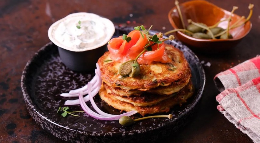 Reikės (4 porcijoms): 15 bulvių, 200 g miltų, 2 kiaušinių, 200 g natūralaus jogurto, 3 petražolės šakelių, 1 šaukštelio kepimo miltelių, aliejaus, druskos; patiekti: 200 g silpnai sūdyto upėtakio, 100 g grietinės, 1 raudonojo svogūno, 40 g kaparėlių, druskos, maltų juodųjų pipirų.
