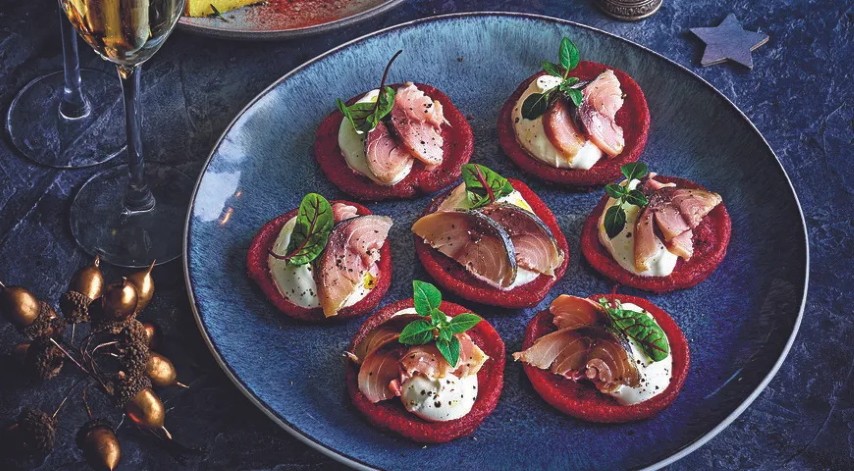 Reikės (12 porcijų): 200 g skumbrės filė, 200 g natūralaus jogurto, 120 g speltų miltų, 50 g grikių miltų, 125 ml pieno, 20 g lydyto sviesto, 2 šaukštų krienų, 1 burokėlio, 1 šaukštelio kepimo miltelių, 1 šaukštelio druskos, žalumynų ir grietinės – patiekti.
