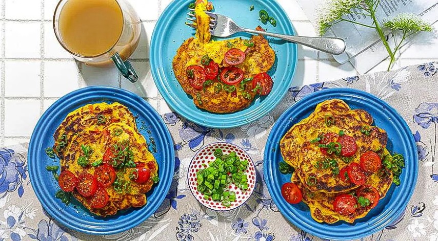 Reikės (4 porcijoms): 250 g miltų, 450 ml pieno, 100 g riebios varškės, 1 kiaušinio, 4 pomidorų, 4 svogūno laiškų, 2 šaukštelių ciberžolės, 1 šaukštelio kepimo miltelių, 5 šaukštų aliejaus, druskos, šviežiai maltų juodųjų pipirų, vyšninių pomidorų ir svogūnų laiškų – patiekti.
