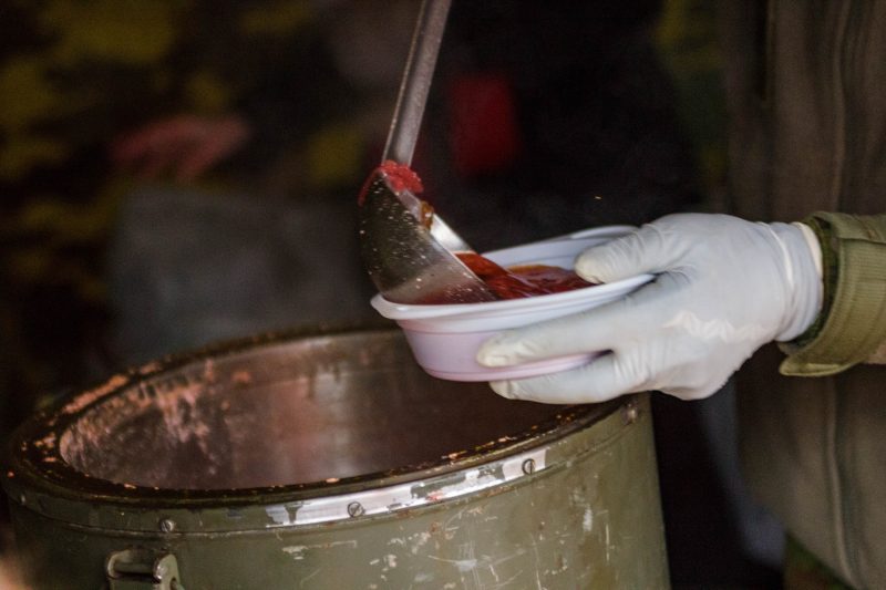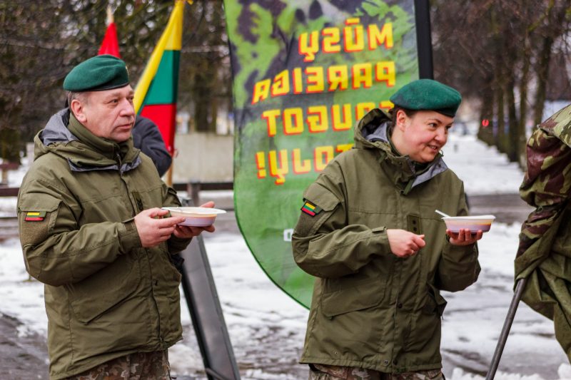 Laisvės aikštėje palapinę pasistatę savanoriai į dubenėlius pilstė karštą karių virtą sriubą, pjaustė rėmėjų dovanotą tortą.