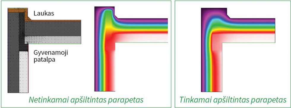 Įrengiant plokščią stogą, neretai per mažai dėmesio skiriama parapetui. Nors lauko sienos ir pats stogas būna apšiltintas tinkamai, parapeto vidinei pusei ir viršui dažniausiai tenka tik penki centimetrai mineralinės vatos, kuria dengiamas viršutinis šiltinamo stogo sluoksnis (jis būtinas stogo dangai prilydyti). Tokio storio nepakanka šilumai sulaikyti. O juk parapetas įprastai juosia stogą visu perimetru, tad susidaro nemažas plotas, per kurį patiriama šilumos nuostolių.