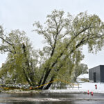 Antradienį maždaug pusę devynių ryto Vilniaus gatvėje netoli naujai atidaryto prekybos centro ant važiuojančio automobilio nuvirto gluosnis. Vienas iš kelių medžio kamienų neatlaikęs sniego naštos lūžo. Laimė, vairuotoja nenukentėjo.