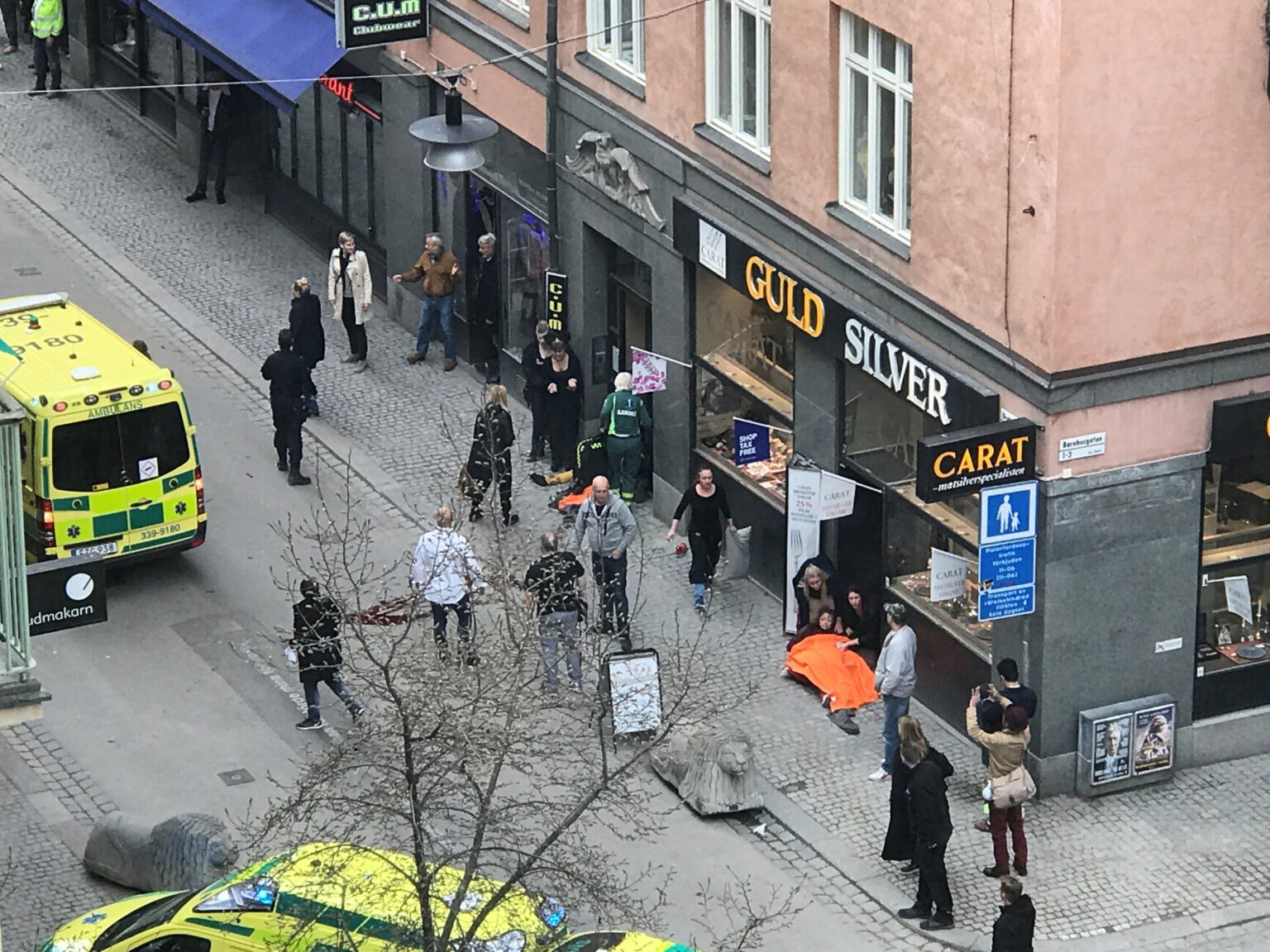 Per televiziją tiesiogiai transliuotuose vaizduose matyti iš prabangaus prekybos centro „Ahlens“, į kurią rėžėsi sunkvežimis, kylantys tiršti dūmai, įvykio vietą uždarė policija, prie užtvarų susirinko minia. Šis centras, kuriame yra įvairių parduotuvių, išdėstytų gatvės lygiu, priklauso plačiam tinklui Švedijoje.