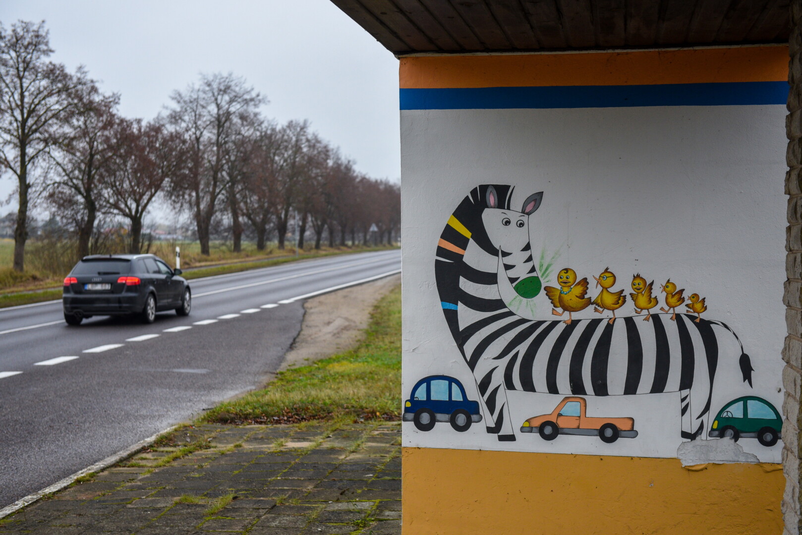 Prieš porą metų Automobilių kelių direkcijos konkursą laimėjusi Sofija Šmakotinaitė Molainių autobusų stotelės paviljoną pagyvino zebriuku. G. Kartano nuotr.