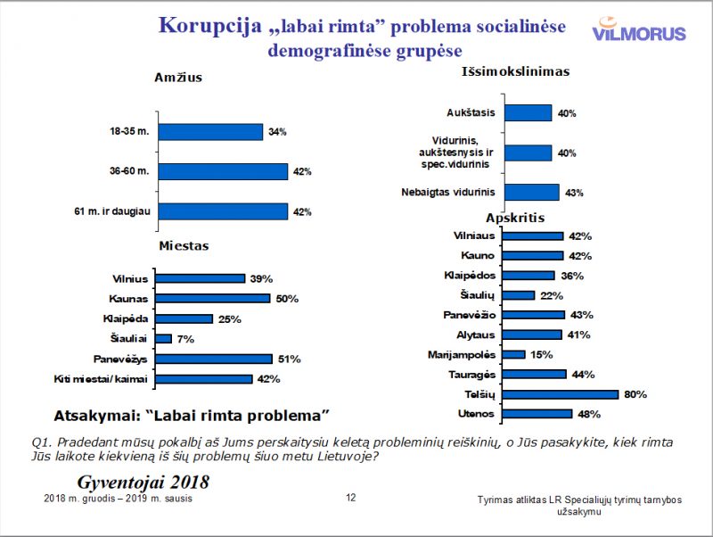 Atvirame klausime apie labiausiai korumpuotas institucijas gyventojai dažniausiai minėjo sveikatos apsaugos institucijas (50 proc.), Seimą (32 proc.) ir teismus (27 proc.).