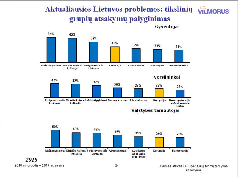 Verslo atveju, atkreiptinas dėmesys, kad 23 proc. įmonių vadovų teigė, kad korupcija Lietuvoje daro neigiamą įtaką jų verslo pajamoms. Beveik kas ketvirtas verslo atstovas korupciją suvokia, kaip kliūtį savo verslo vystymuisi. Tyrimo duomenimis – 2018 m. 8 proc. verslo atstovų davė kyšį.