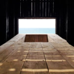 Vienintelė šviesi koplytėlės dalis – grindys. Toks sprendimas pasiteisino ir konceptualiai (baltos grindys kuria kontrastą), ir praktiškai, nes psichologiškai žmogus nenori sėstis ant juodo paviršiaus baimindamasis išsitepti, nors medis prieš tai buvo nušlifuotas ir nuteptas laku.