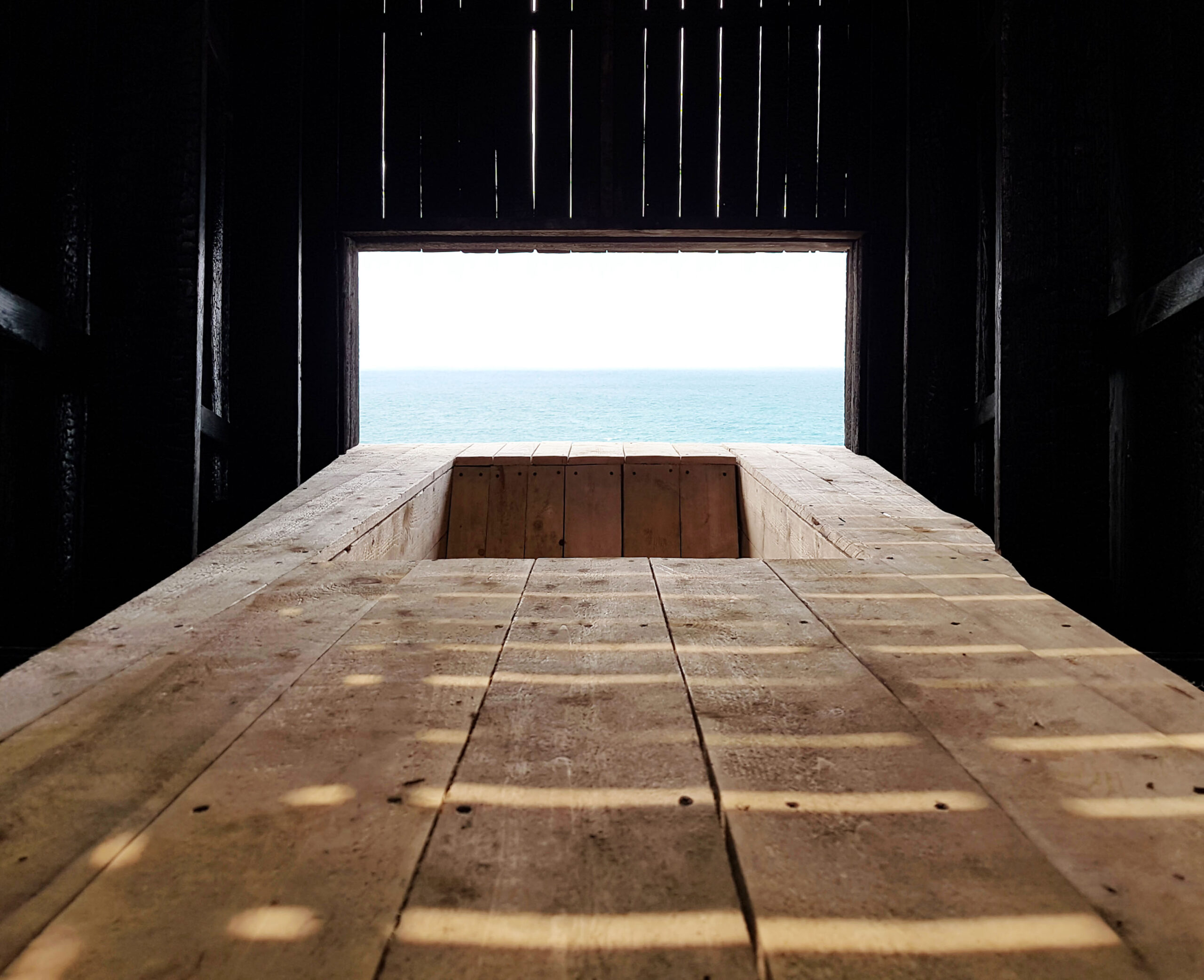 Vienintelė šviesi koplytėlės dalis – grindys. Toks sprendimas pasiteisino ir konceptualiai (baltos grindys kuria kontrastą), ir praktiškai, nes psichologiškai žmogus nenori sėstis ant juodo paviršiaus baimindamasis išsitepti, nors medis prieš tai buvo nušlifuotas ir nuteptas laku.