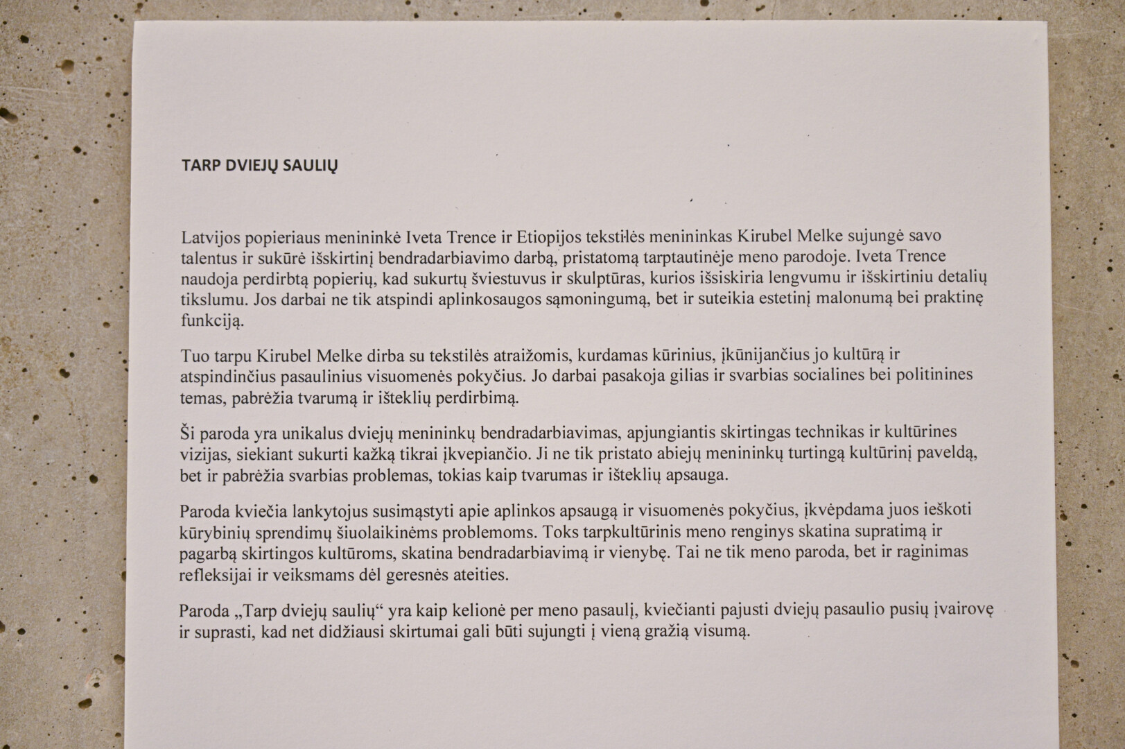 Pirmą kartą Lietuvoje surengę bendrą parodą Panevėžio kūrybiškumo centre „Pragiedruliai“ popieriaus menininkė iš Latvijos Iveta Trencė ir tekstilininkas iš Etiopijos Kirubelis Melkė tarsi kviečia į kelionę po dvi labai skirtingas kultūras ir ragina suprasti, kad net didžiausi skirtumai gali būti sujungti į gražią visumą.
