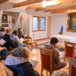 Giedotojai sutinkami svetainėje, vaišinami pačių vienuolių surinktų ir paruoštų gilių kava.