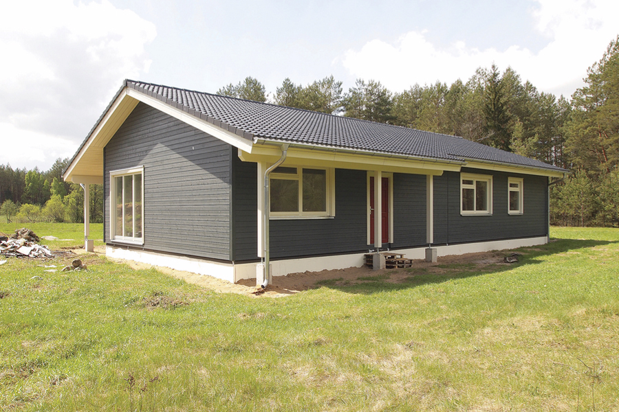 Taigi projektas pakito neatpažįstamai: pradinis variantas buvo perdarytas į vieno aukšto 150 kv. metrų namą. Iš pirmo žvilgsnio pastatas atrodo visai nedidelis, tačiau vietos jame pakanka viskam: įrengti trys miegamieji, didelėje gyvenamojoje erdvėje tilpo svetainė, valgomasis ir virtuvė. Žinoma, dar yra katilinė, dvi higienos patalpos, ūkinė patalpa su skalbykla ir holas.