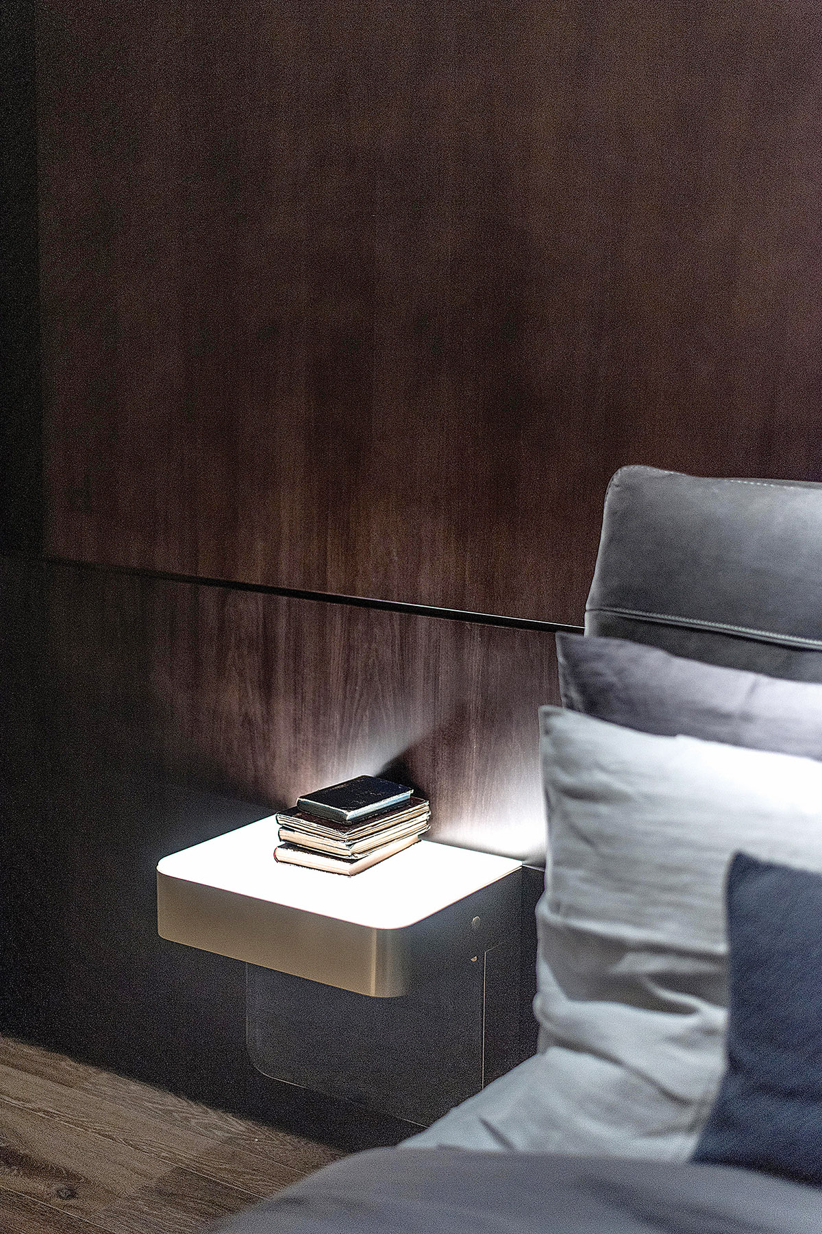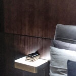 Labiau minimalistinio ir dailaus baldo nei pakabinamas staliukas nėra. Jis visuomet aktualus, praktiškas ir funkcionalus, nes turime ir vietos daiktams pasidėti, ir laisvas grindis. Rudų ir pilkų atspalvių gama gali atrodyti pernelyg paprasta, bet ji gyvybinga ir jausminga, kai priderinama matinė aukso spalva. Šitaip sukuriama moderni ir graži erdvė. Atsipalaiduoti ypač lengva ramioje aplinkoje, kurios vaizdas švelnus ir jaukus. Ryškias spalvas kompensuos skirtingų tekstūrų daiktai: medinė siena ir grindys, odinė lova ir lininė patalynė.