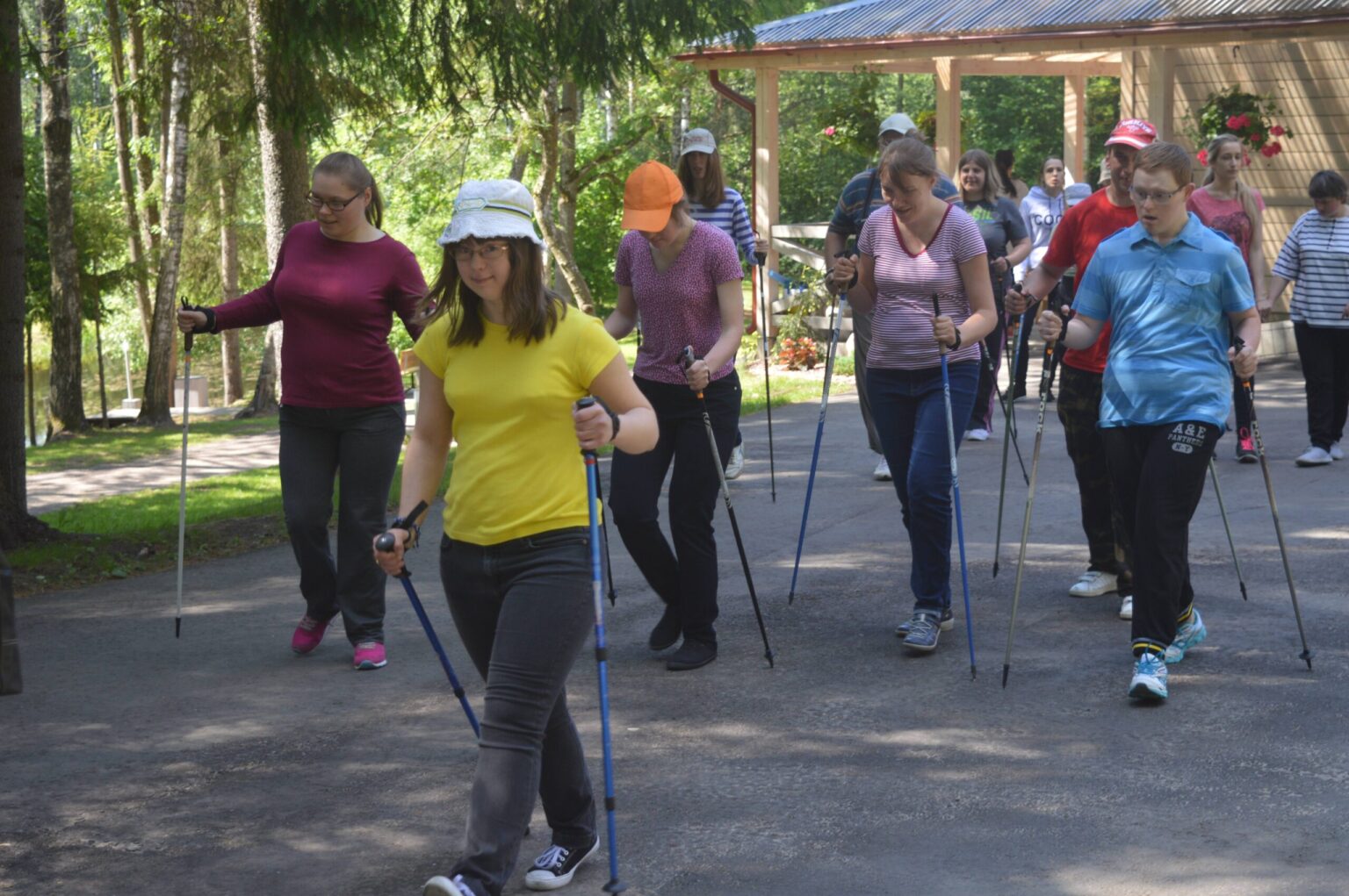Džiugu, kad turėjome galimybę pasikviesti žinomus sveikatinimo specialistus ir įsigyti šiaurietiško ėjimo lazdų. Eiti su tomis lazdomis – tai fantastiška treniruotė gryname ore, kai pagerėja fizinė būklė, žmogus būna žvalus, atsiranda pasitikėjimas savimi. O esant tinkamai mitybai lengvai išsprendžiama antsvorio problema. Ėjimo technikos ir kitų subtilybių neįgalusis jaunimas mokėsi Šiaurietiško ėjimo mokykloje su Taisa Balčiūniene.