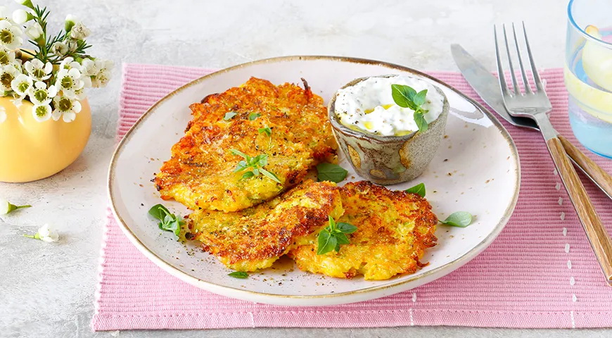 Reikės (4 porcijoms): 600 g cukinijų, 200 g morkų, 20 g česnakų, 1 didelio kiaušinio, 250 g brinzos, 100 g manų kruopų, 15 g kukurūzų krakmolo, druskos, šviežiai maltų juodųjų pipirų, lydyto sviesto arba aliejaus – kepti.